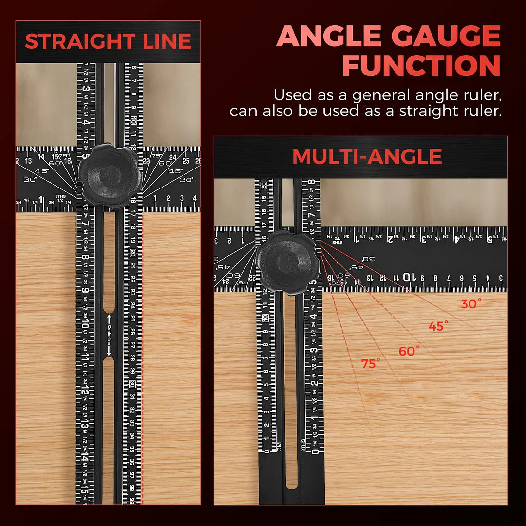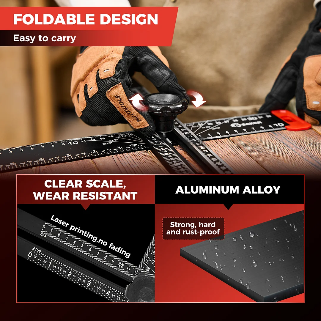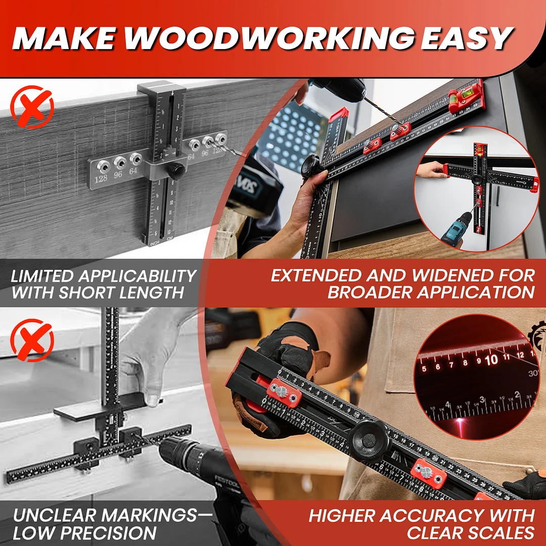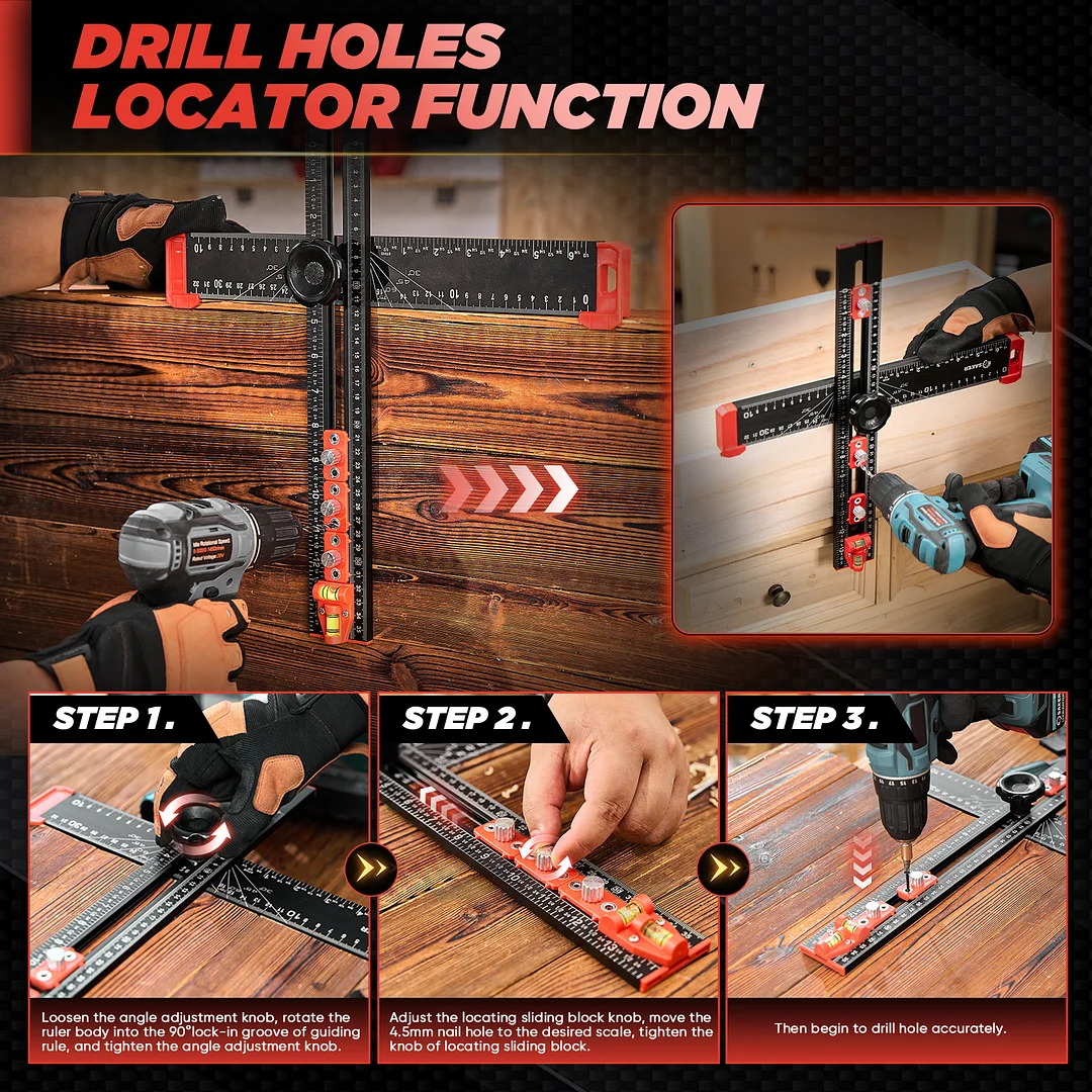 EXPANSIVE UTILITY: Beyond its primary role in drilling, the Saker 4-in-1 Drilling Positioning Ruler proves invaluable for diverse applications including the precise installation of door handles, crafting bespoke shelves, and constructing cabinets. Its multifaceted design enables versatility, rendering it an indispensable tool for an array of woodworking and DIY projects. HIGHLY ACCURATE: The saker drill positioning ruler doubles up as a marking gauge woodworking tool, boasting three sets of adjustable positioning blocks. This innovative design ensures enhanced precision, facilitating swift and accurate drilling, nailing, or marking tasks. Elevate your woodworking projects with increased efficiency and accuracy with this versatile tool. DUAL-AXIS BUBBLE LEVEL: Saker woodworking square comes with auxiliary dual-axis bubble levels, aiding in the calibration of both horizontal and vertical alignments. This feature ensures precise leveling and perpendicularity, facilitating accurate drilling and installation tasks, even on uneven surfaces. RELIABLE MATERIAL: Crafted from premium aluminum alloy, the Saker 4-in-1 drilling positioning ruler guarantees durability and resilience. The wear-resistant printing ensures longevity, safeguarding against fading and preserving precise measurements throughout extended use. VERSATILE ADJUSTABLE CAPABILITY: Saker T square ruler features ABS knobs for effortless adjustment of length and angles, ensuring flexibility in measuring both dimensions and angles. With this versatile capability, users can easily adapt the tool to accommodate various project requirements.