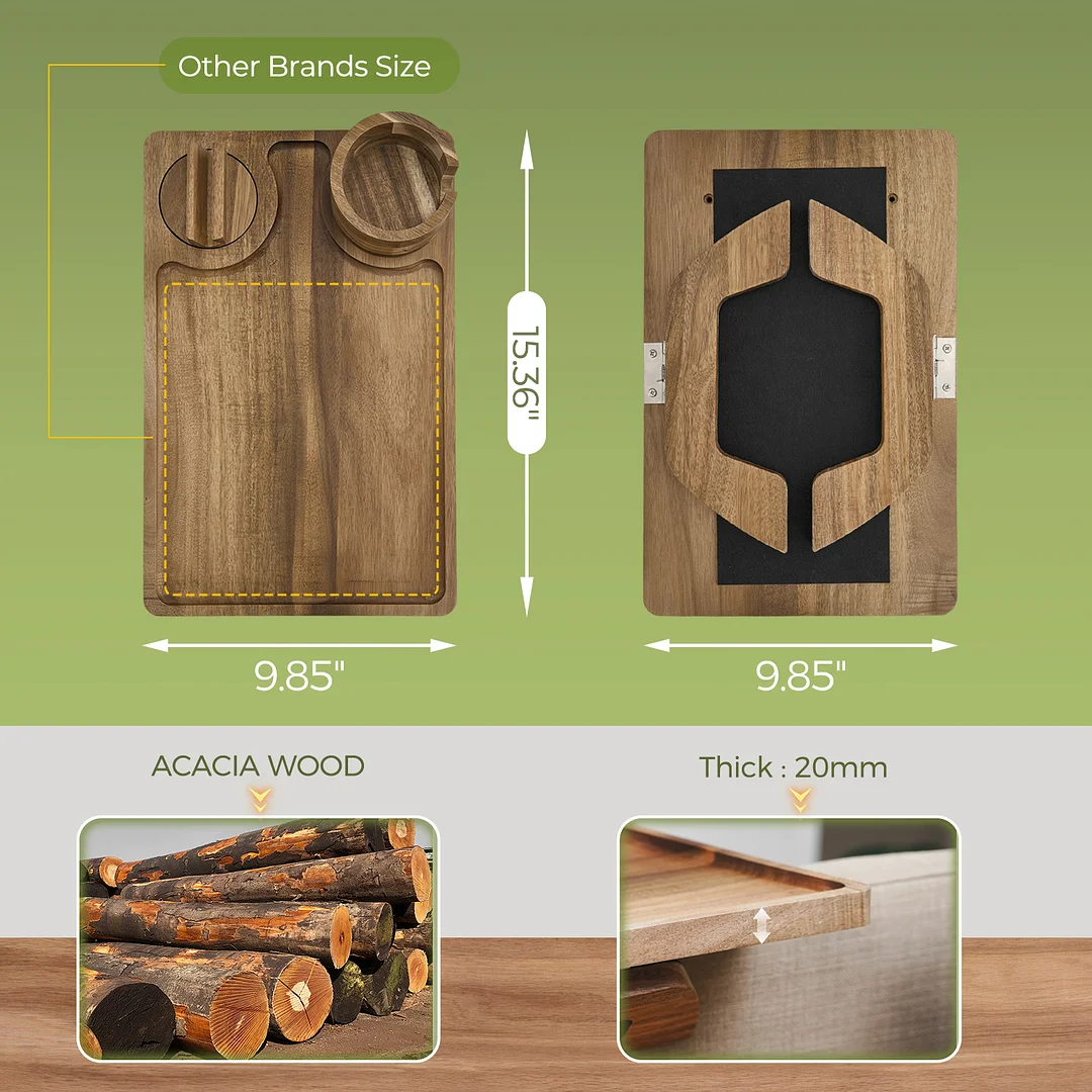 Safety design: The sofa tray table and charcuterie board are made of wooden material, retaining the original wood grain for a stylish and durable look. The material is sturdy, resistant to deformation, and easy to clean. Both surfaces are smooth with no sharp edges, preventing damage to leather sofas and reducing the risk of accidental collisions.