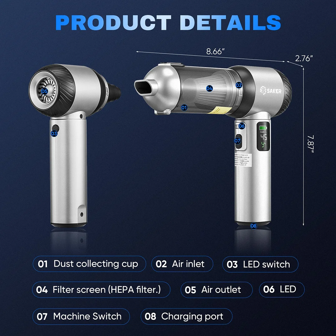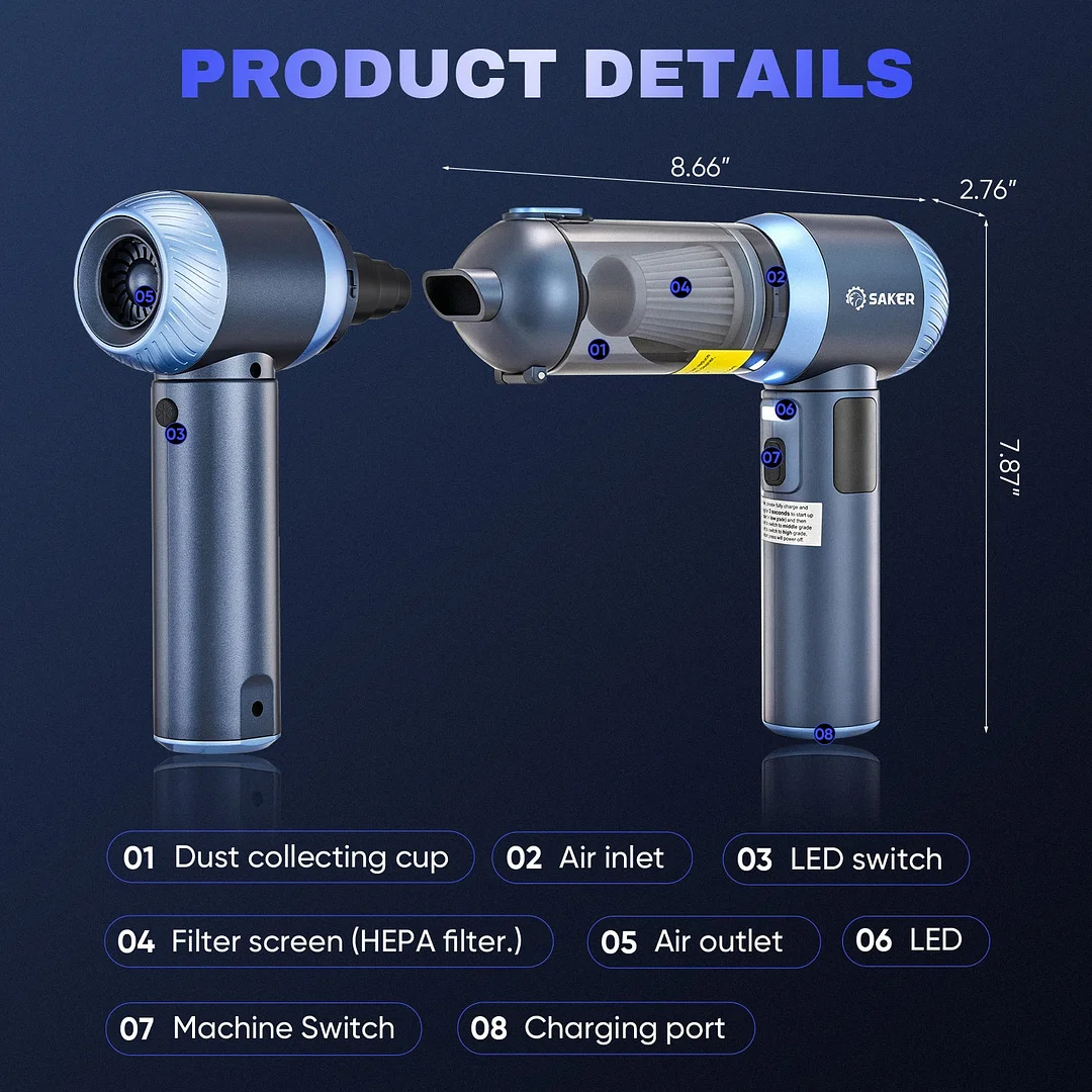 Multifunctional cleaning & inflation tool: The Saker Car Vacuum is more than just a mini vacuum cleaner,it offers powerful suction, dust blowing, vacuum sealing, and even inflation for travel gear. Perfect for car interiors, home use, and on-the-go needs.