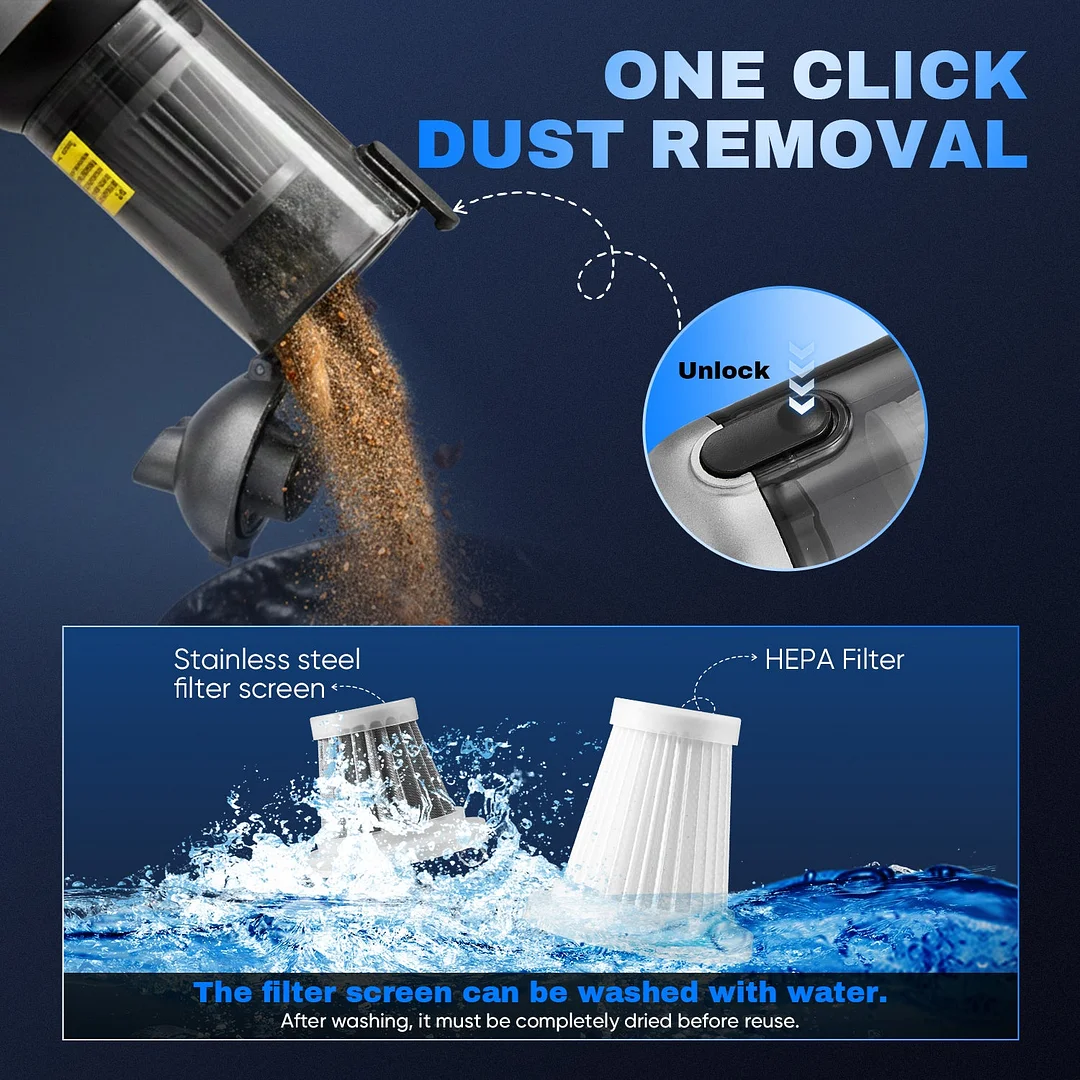 One-touch dust disposal design: Empty the dustbin in seconds with the single-button release. The compact design makes this Saker Mini Vacuum Cleaner ultra-portable and easy to store in any glove box or drawer.