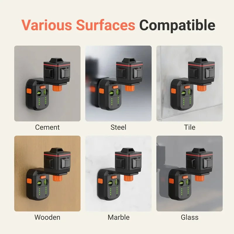 SAKER wall laser level for hanging pictures is adaptable to various surfaces including wood, glass, cement, marble, steel, tile, etc.