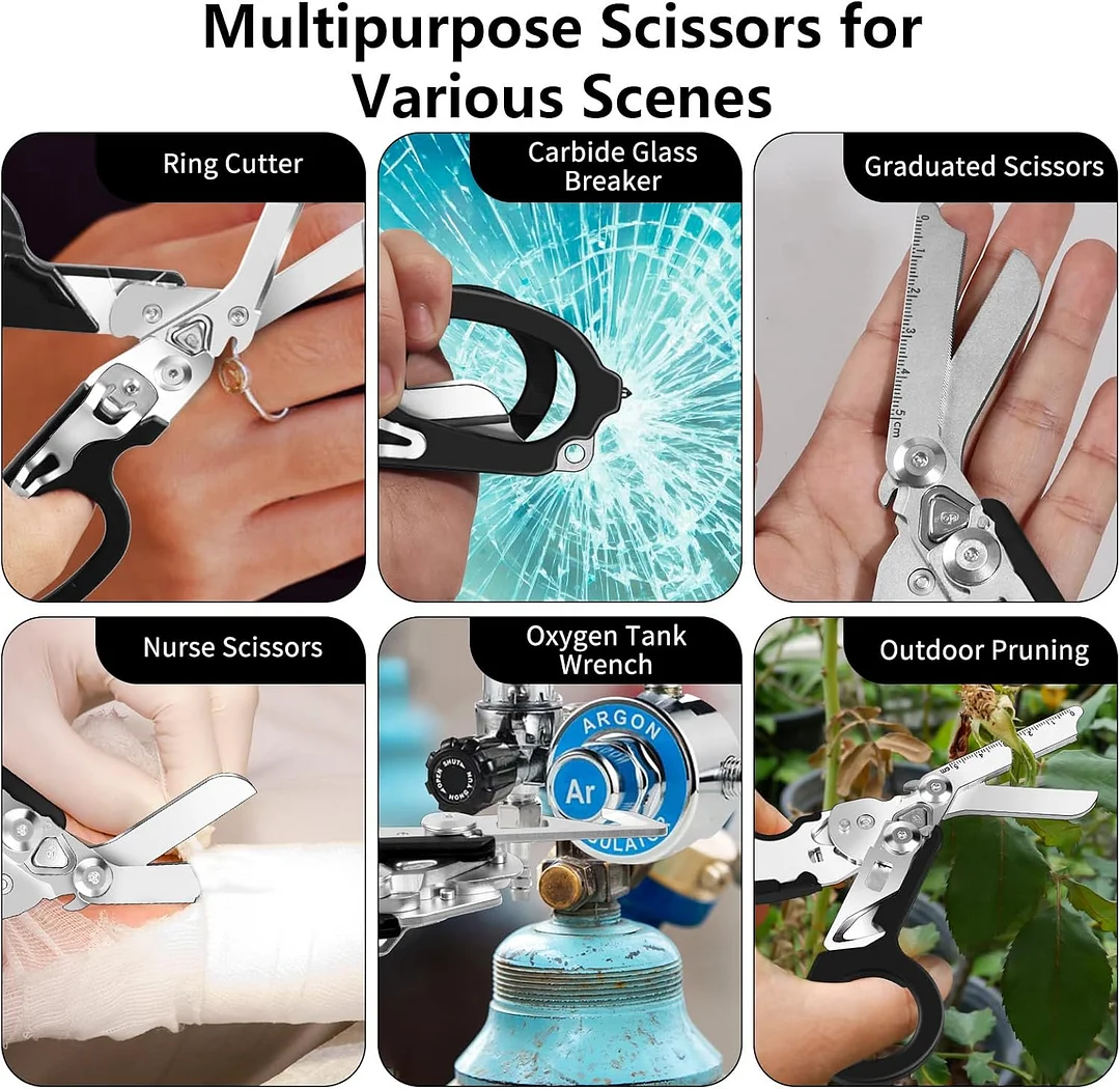 The multifunction emergency response shears make an excellent gift for any outdoor enthusiast or anyone who enjoys activities such as fishing, hunting, camping, hiking, or backpacking. It can be used as a trimmer to handle thin metal slicers , or as a safety hammer for getting out of your car in an emergency. Because of the specially designed sheath, you are able to carry your tactical scissors whether they are open or folded to ensure you are always prepared. Equipped with a multi-functional adventure scissors that can open the oxygen tank, your journey is like being accompanied. It's an essential tool in any emergency kit and can be a thoughtful gift for your husband, boyfriend, or father.