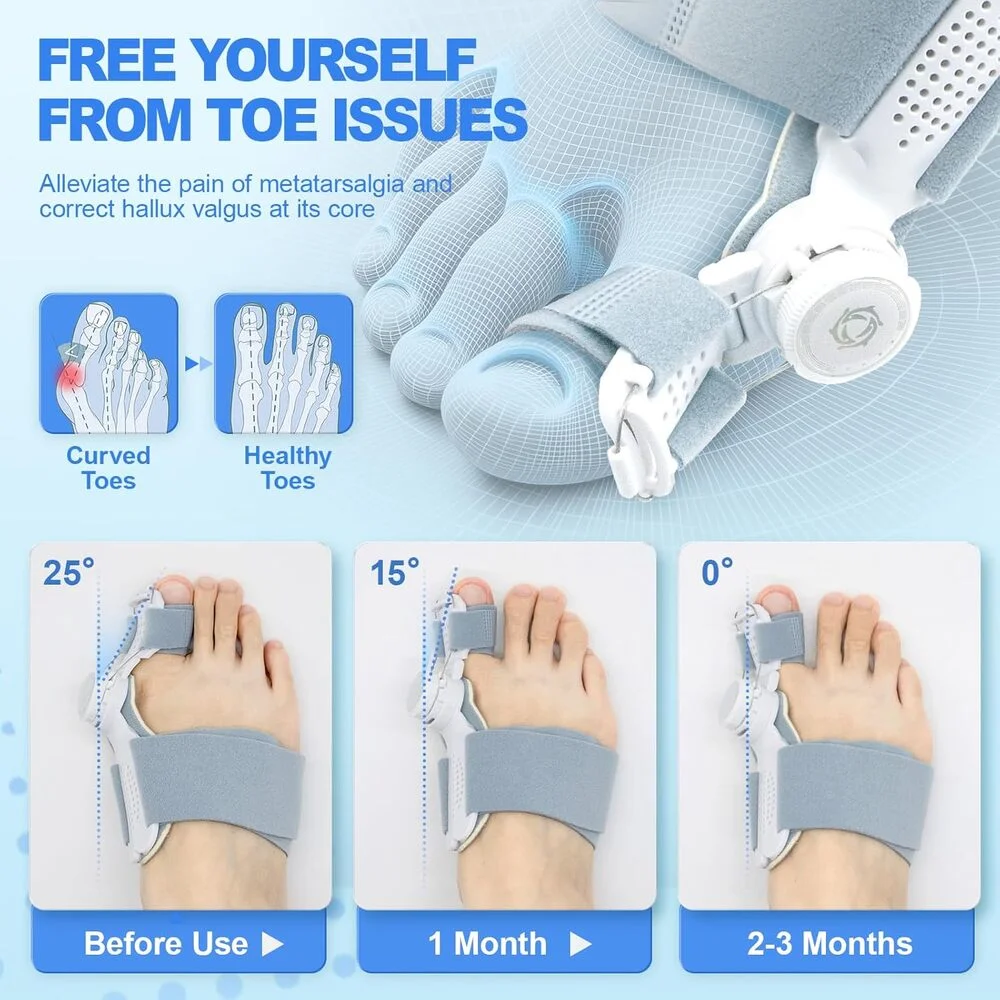 The 180° adjustable bunion corrector: Designed with a 180° adjustment range, the bunion corrector adapts to different bunion conditions. The easy-to-use magic band ensures a snug fit, stable support, and effective pain relief. A thickened bunion pad reduces friction and pressure on the joints, while the soft, breathable relief sleeve can be worn under socks and shoes for continuous correction anytime, anywhere.