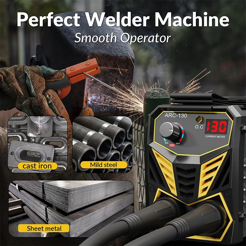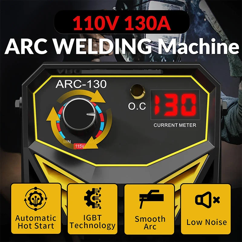 110V 130A ARC welding machine: This 110V 130A MMA welding machine is ideal for E6011, E6013, E6014, E7018, and welding rods below 1/8 inch. It can weld 10 electrodes in a row without protection, with a high-duty cycle.