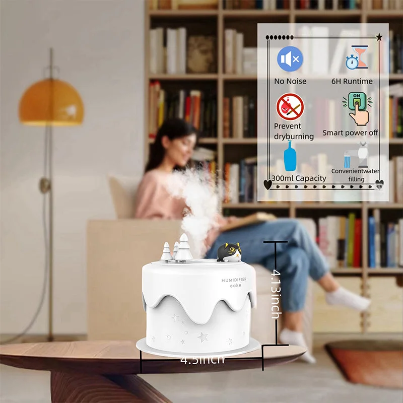 Quiet humidification ensures sleep: A 300ML water tank can moisturize the room for a long time, with low humidity up to 12 hours and high humidity up to 6 hours, ensuring that family members can breathe more easily throughout the day. Help improve dry environments, reduce physical discomfort, dry mouth, cough, dry skin, nasal and throat discomfort, and enhance body comfort.