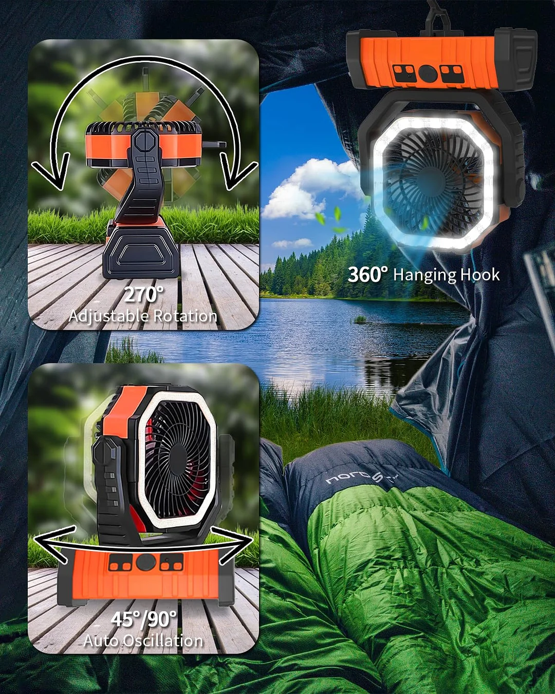 Multi-Dimensional Airflow System: Selectable 45°/90° oscillation provides you a comfortable and natural wind instead of straight wind (The angle can also be fixed). Our portable fan is designed with 270° manual upside down pivoting. 360° Hanging Hook design allows you to hang it anywhere and at any direction.