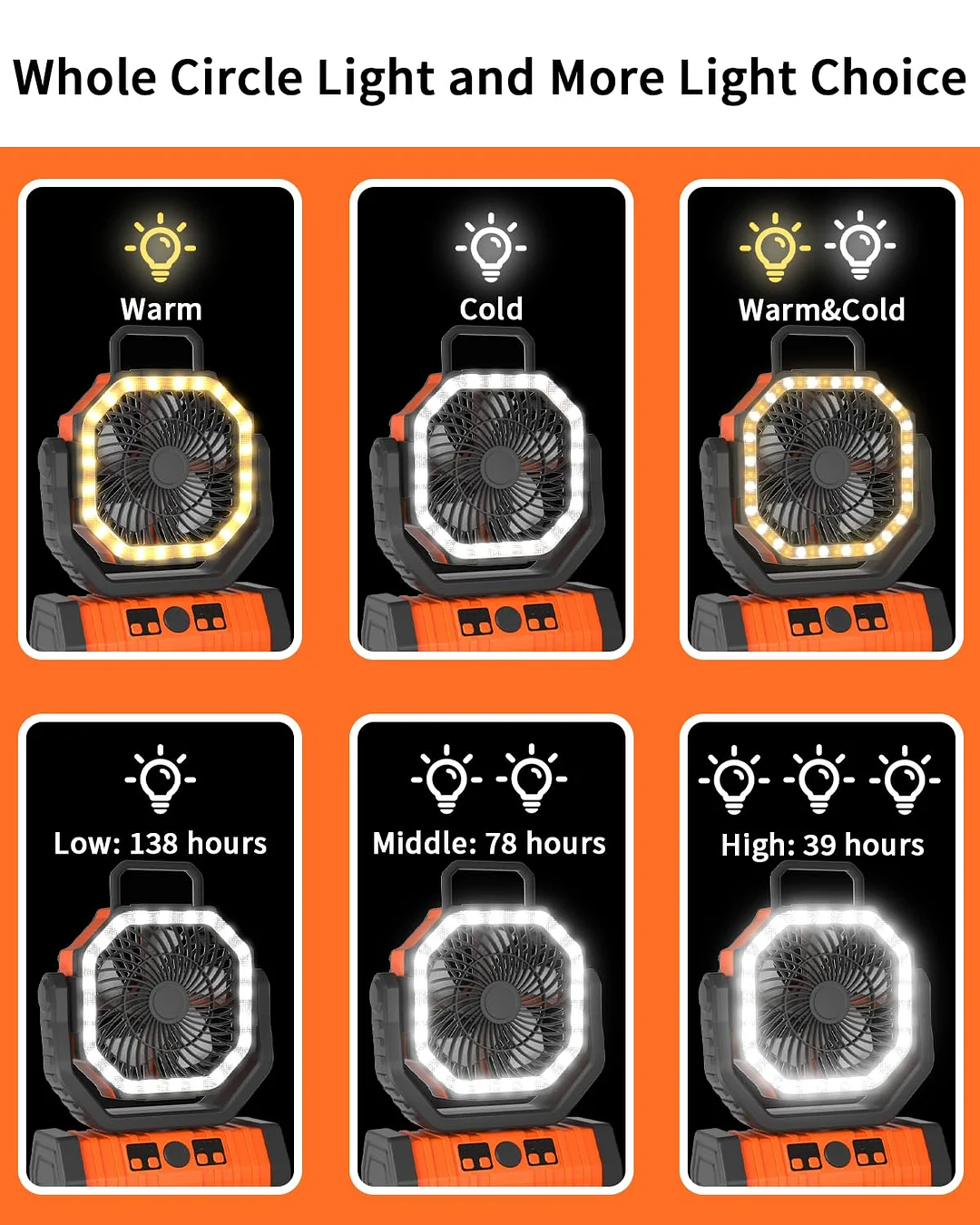 3 Level of light brightness & 3 color temperature: This camping tent fan with LED latern can illuminate your enviroment when it's dark. 3 color temperature, warm/cold/warm&cold, provide more options to meet your preference. Choose from low brightness to high brightness, a fully charged battery fan can be used for 138-78-39 hours.
