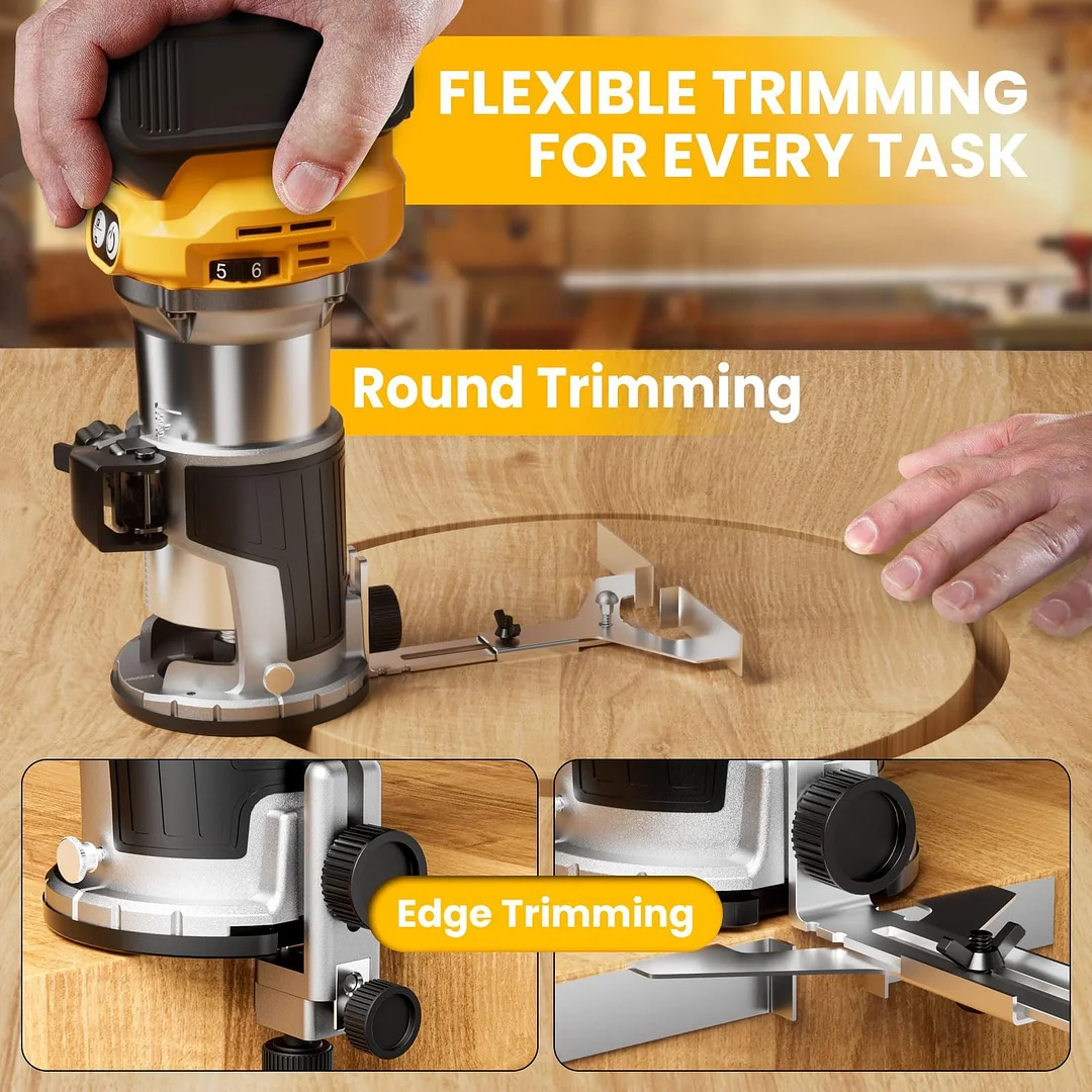 Expanded 6-piece accessory kit: Now includes 6 premium bits, edge guide, roller guide, aluminum guard, and dust port. Cordless compact router tackle edge trimming, carving, and dust-free routing with enhanced precision.