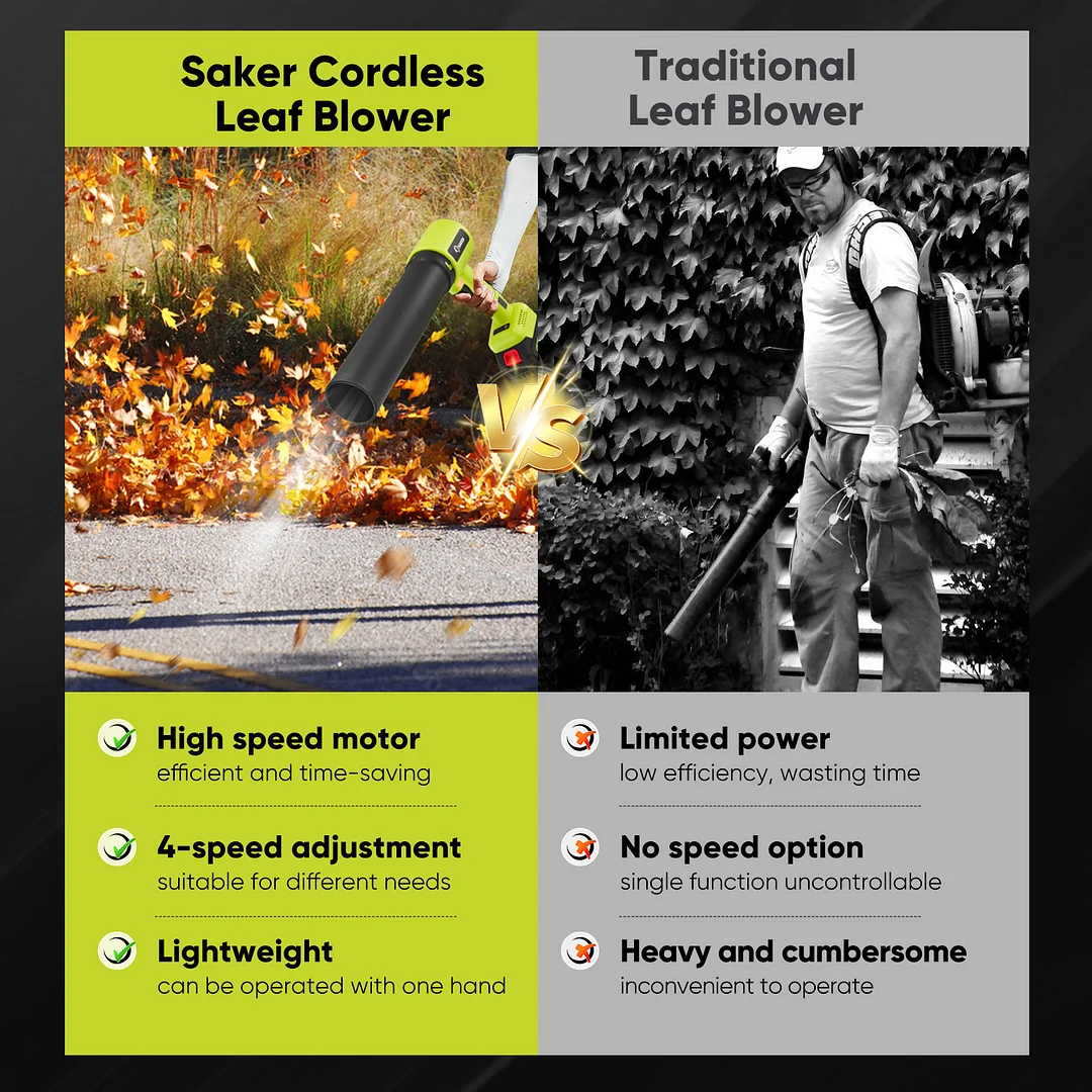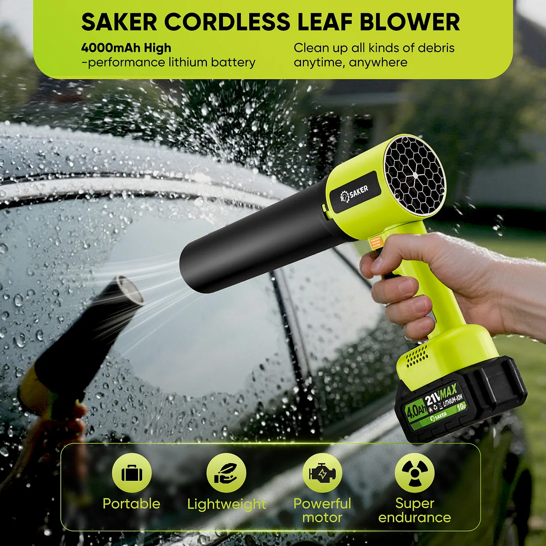 Multi-function Application: Saker 2025 upgraded portable cordless leaf blower is designed for multiple uses. It is not only suitable for home cleaning, such as car drying, dust removal, and yard leaf blowing, but also very suitable for outdoor scenes, such as fire-fighting and outdoor barbecue. With its powerful performance, it can efficiently complete various cleaning tasks.