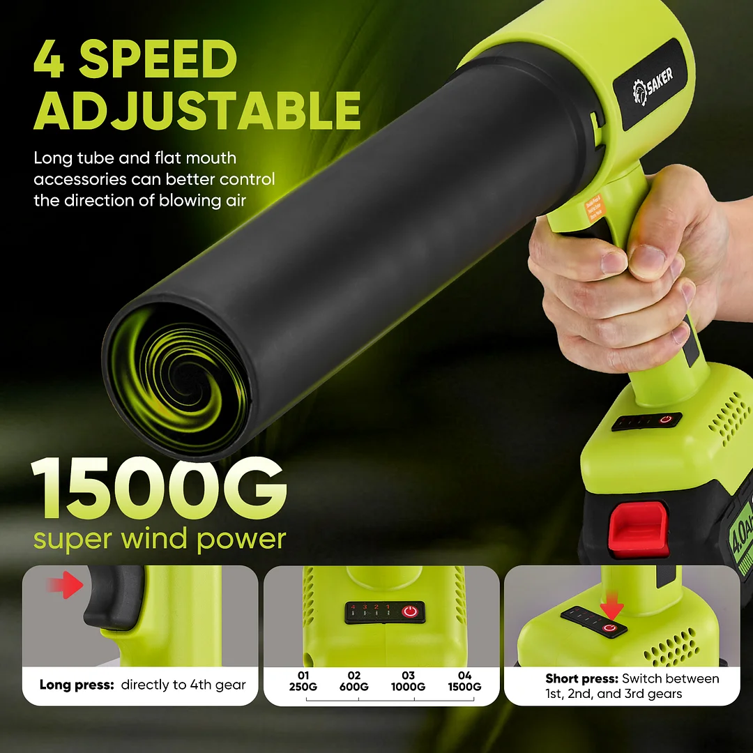 4-Speed Adjustment: This Saker cordless leaf blower features 4-level wind force adjustment, allowing you to switch between different gears according to different scenarios easily. Whether you need gentle blowing for delicate areas or powerful blowing for large-scale debris, it can meet your requirements with ease.
