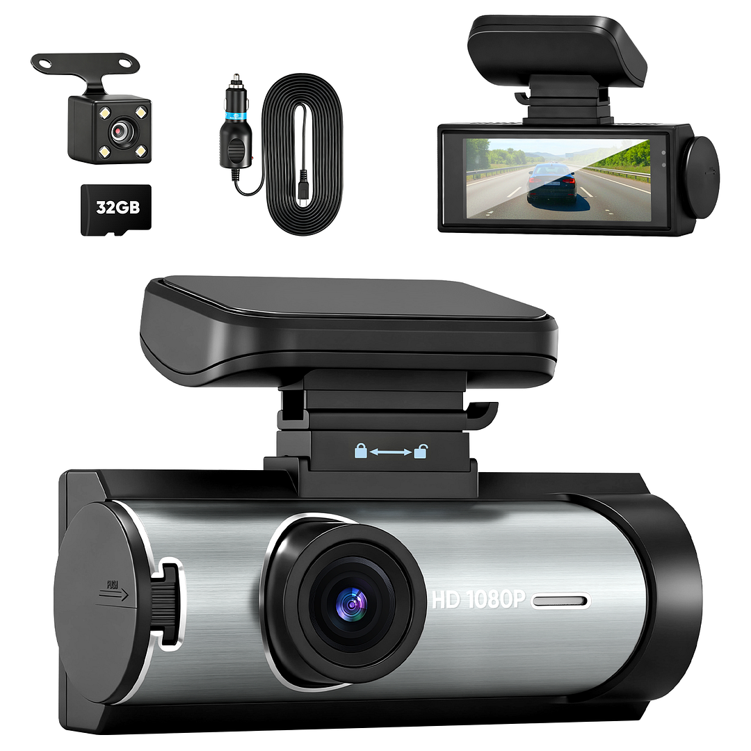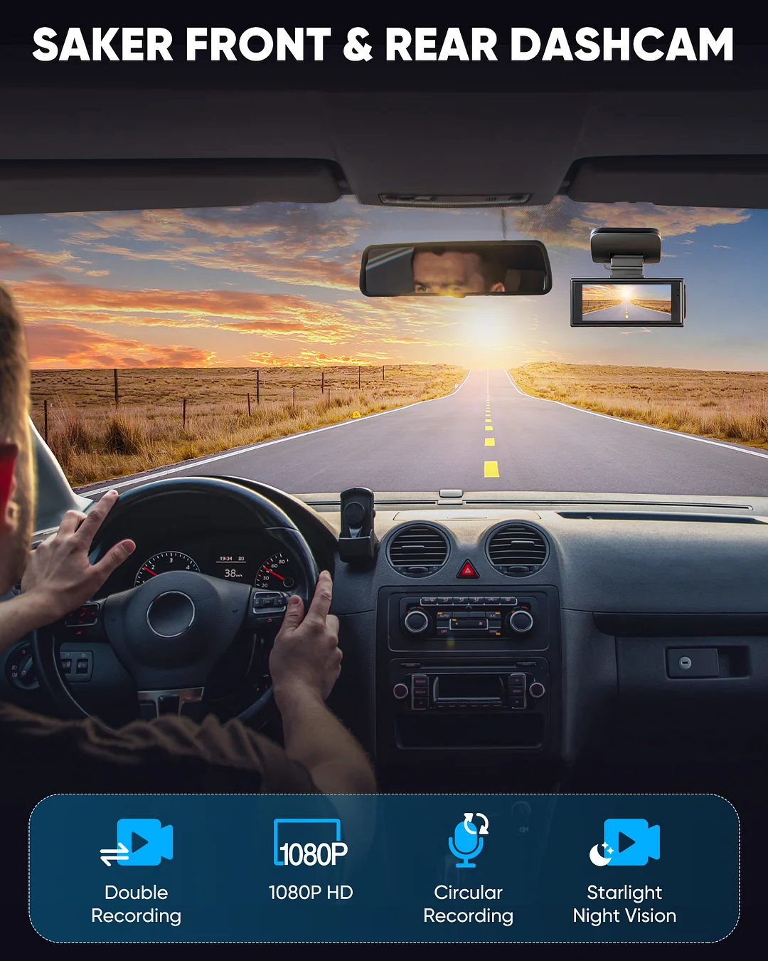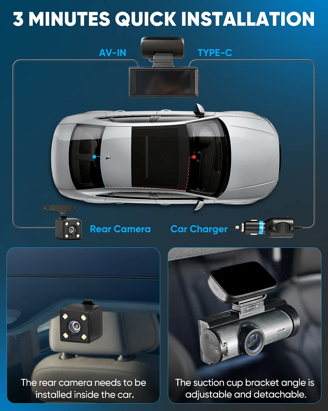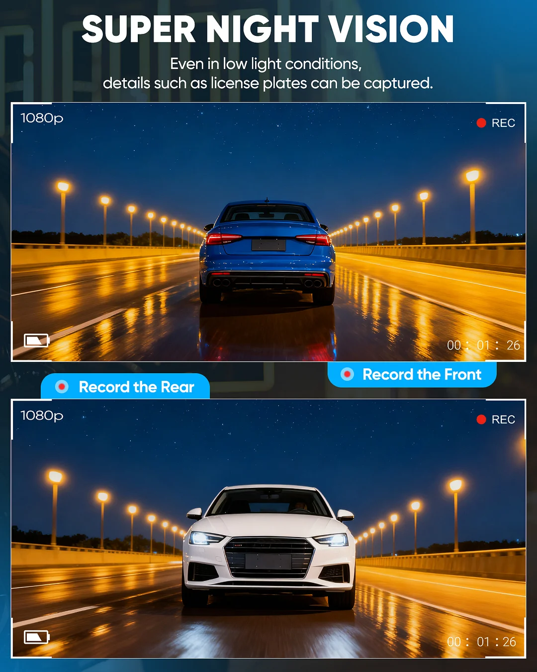 Night vision and 3 IR lights for 24/7 security: Never miss a detail, day or night. Our enhanced night vision technology and 3 infrared LEDs ensure Full HD clarity in complete darkness. The interior light illuminates passengers without glare, while the front light cuts through low-light roads. Drive with confidence, anytime!
