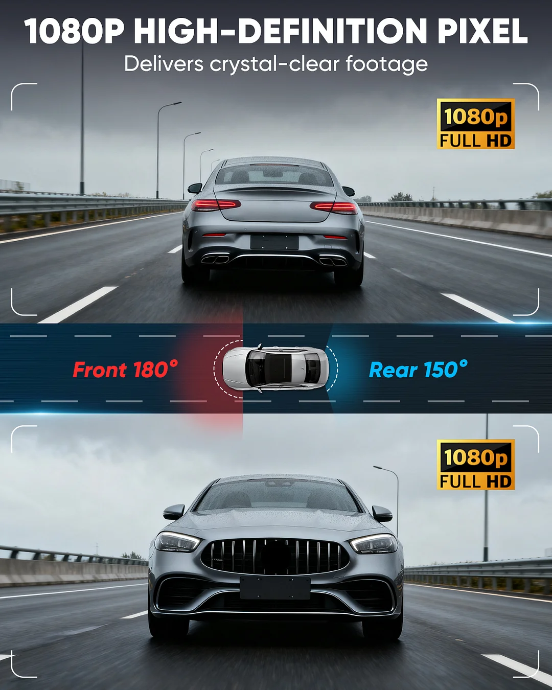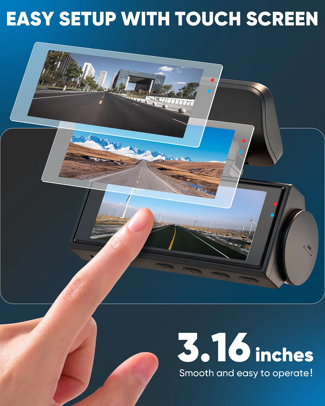 1080P HD recording + 180° rotating interior camera: Capture clear images simultaneously. The 150° wide-angle front camera records the road ahead in 1080P, while the 180° rotating interior camera monitors your cabin. The dash cam features a large 3.16-inch IPS screen that captures every detail of both the road ahead and the interior of the vehicle simultaneously on both screens.