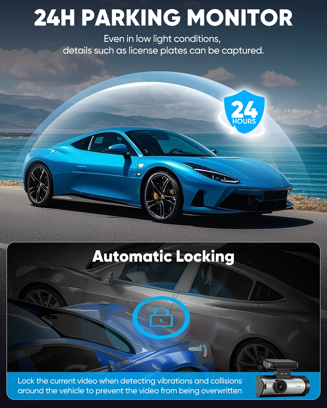 24-hour parking monitor: Protect your car even when it's parked. The dash cam will automatically wake up and record if impacts/shakes are detected. The 24-hour parking monitor can continuously record for 24 hours in parking mode with a time-lapse function. (Note: the recorder will turn off automatically when the engine is off, and you need to provide your own step-down cable to connect to the car battery for power.)