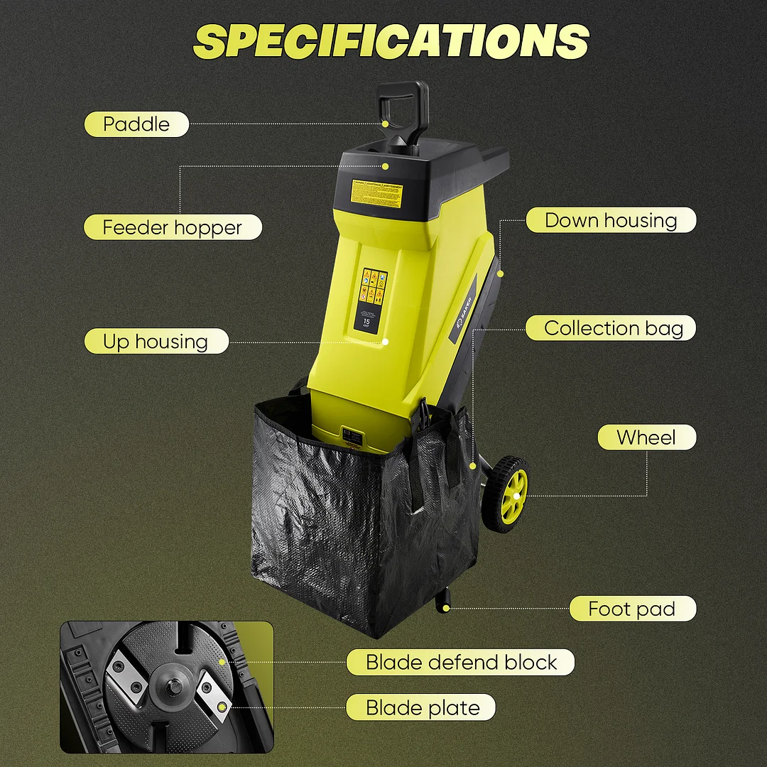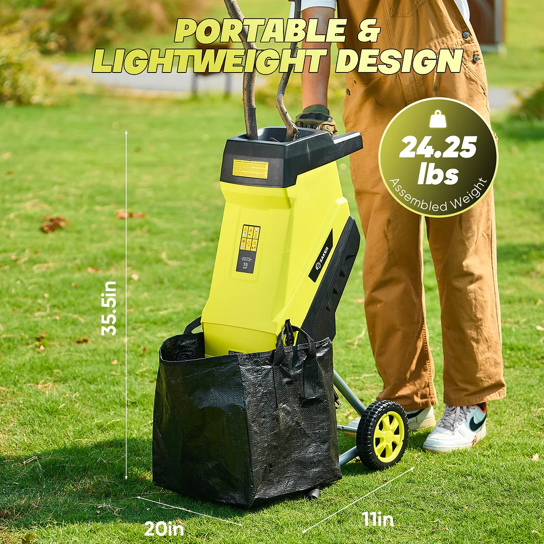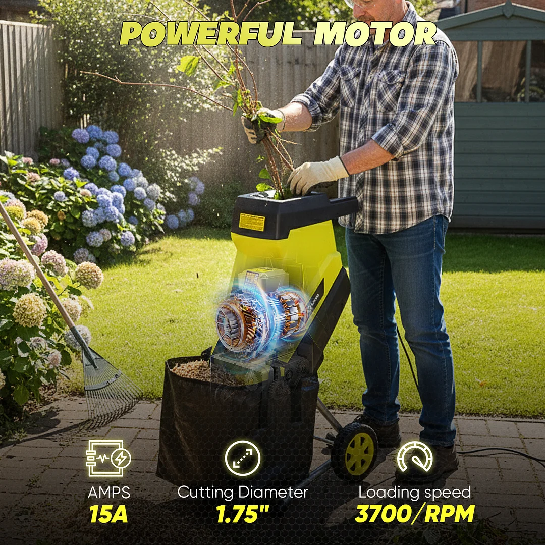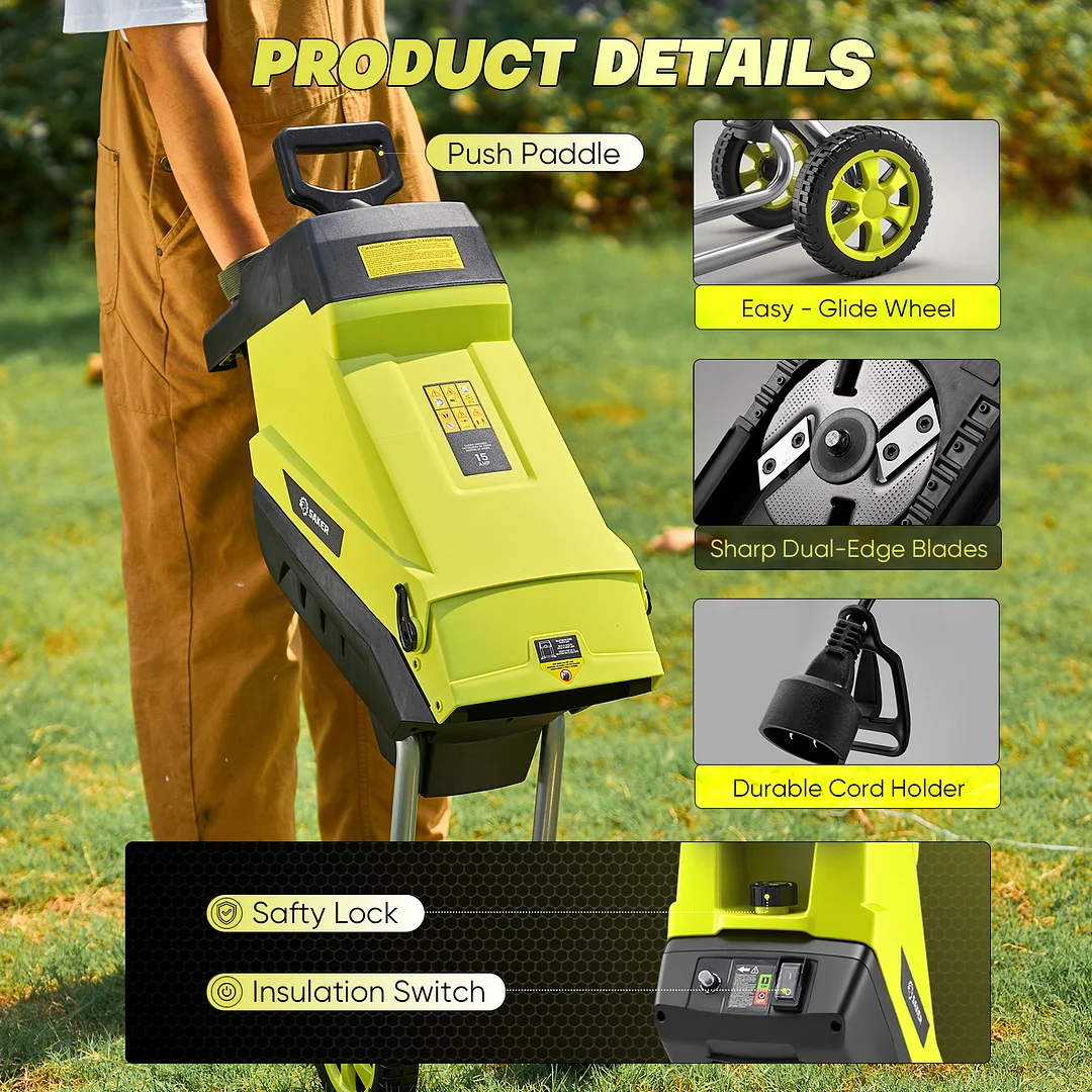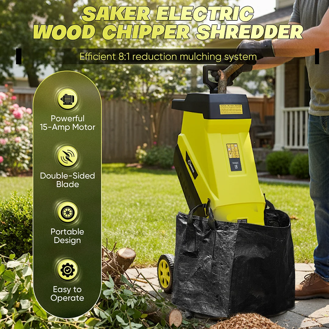 Powerful 15-Amp Motor: This 15-Amp Saker electric wood chipper effortlessly shreds branches and sticks up to 1.75 inches thick. The 3700 RPM blade ensures fast, clean cuts—ideal for garden and yard waste.