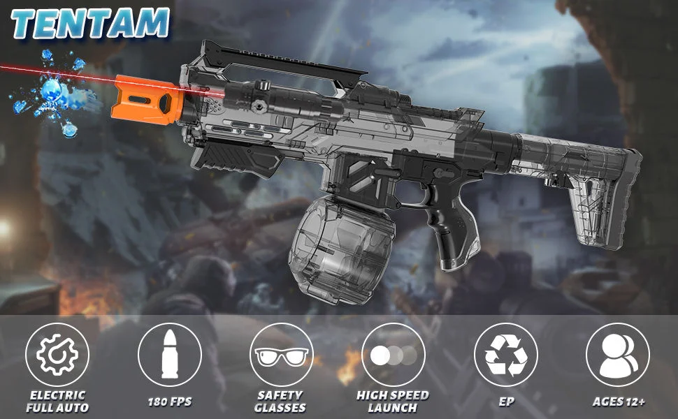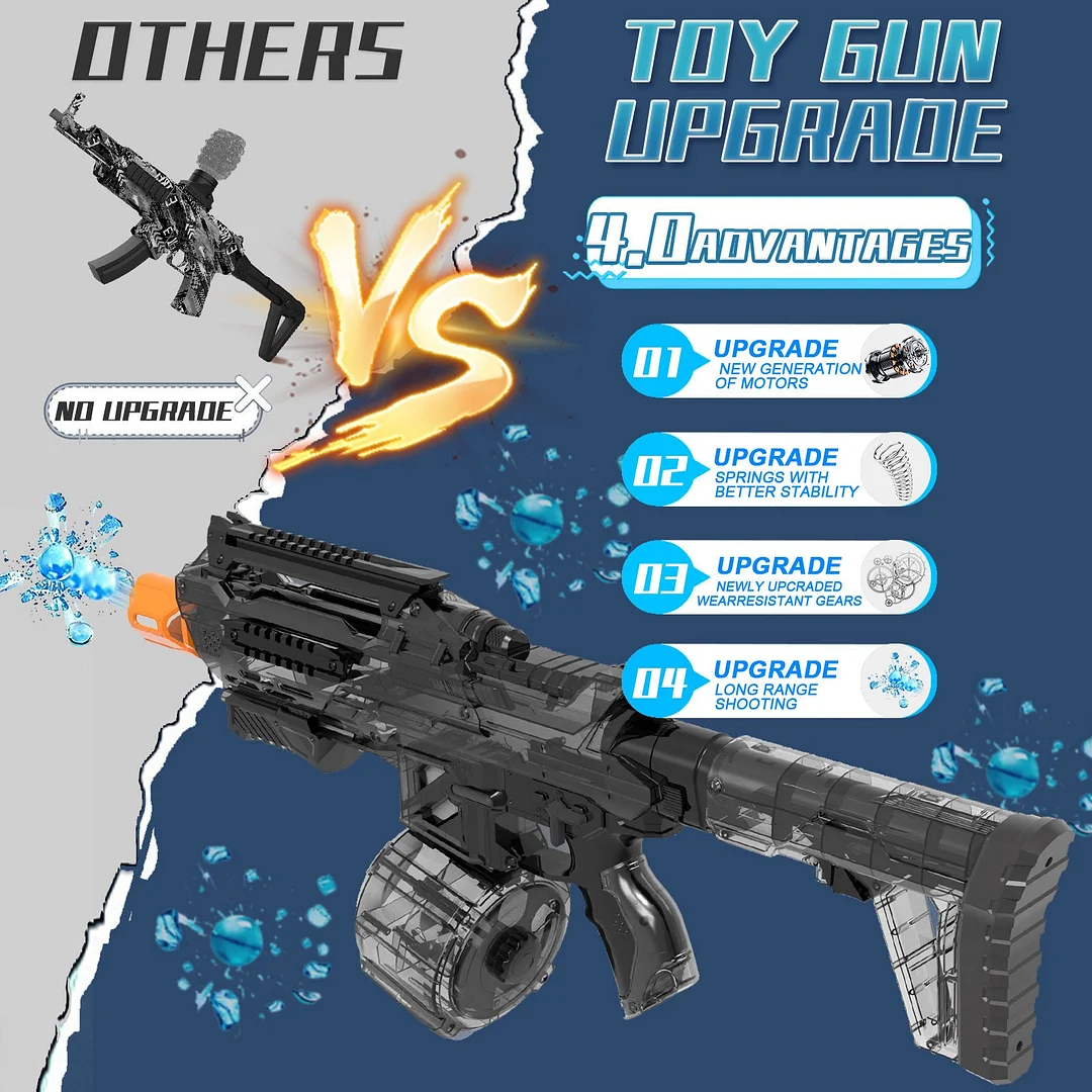 Safe and eco-friendly: Made from a special water-absorbing gel polymer, non-toxic and skin-friendly. It will break immediately upon hitting an obstacle and disappear completely once dry, leaving no residue. It’s a safe toy that won’t harm people or objects. This automatic blaster is a favorite in outdoor shooting games.