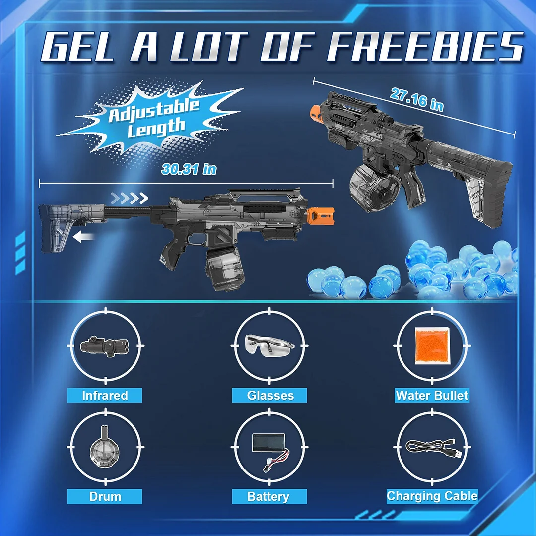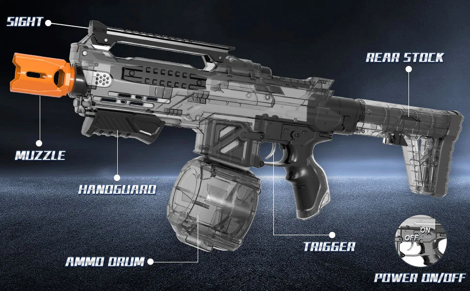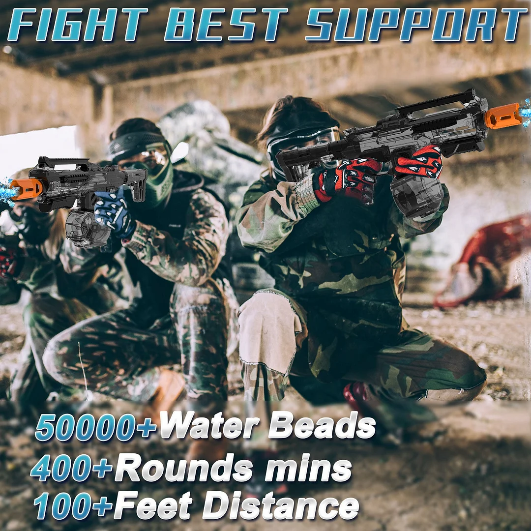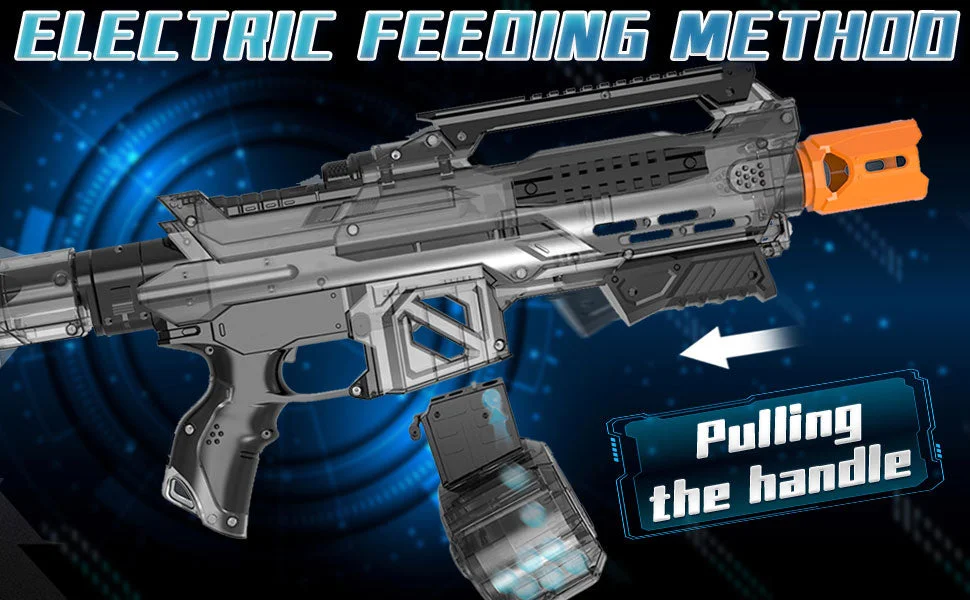 Electric feeding system: The latest electric feeding technology allows you to preload the bullets by pulling the handle, doubling the continuous shooting time and continuously enhancing your battle experience! The handle length can be adjusted, and the gears can be customized to suit your needs, enhancing the shooting feel in the game and extending the range. This is the perfect design for a Gel Ball Blaster.