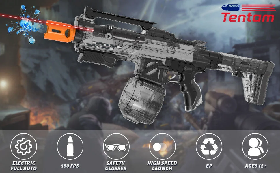 Warm tips: For the continuous use of blaster toy,no pour water into the blaster body or magazine,It is easy to shorten the life of toy guns Please wear protective safety Goggles (included) before use.Do not aim eyes or face.No Standalone lithium batteries are sold with the product.