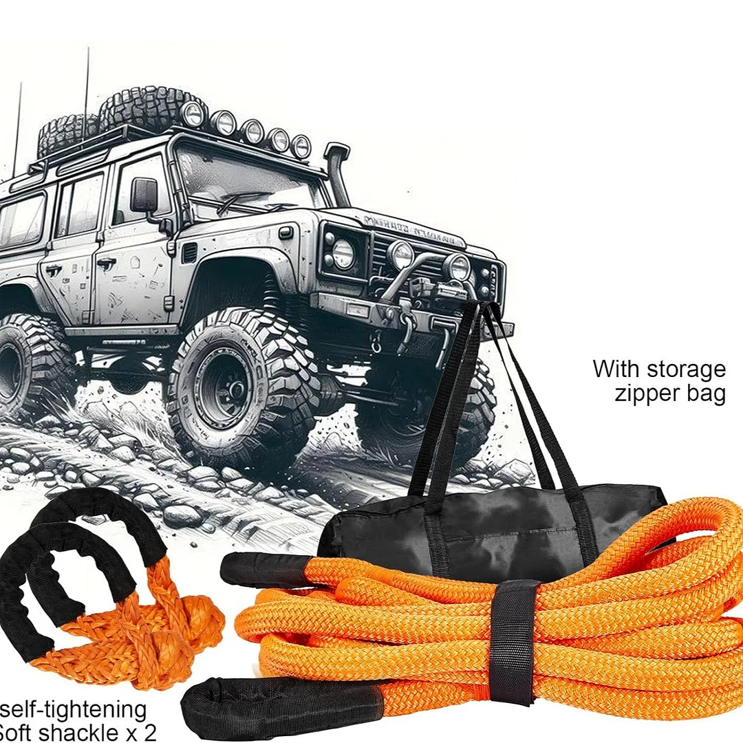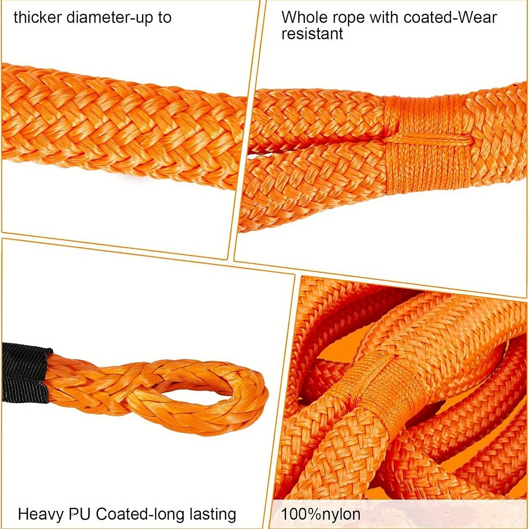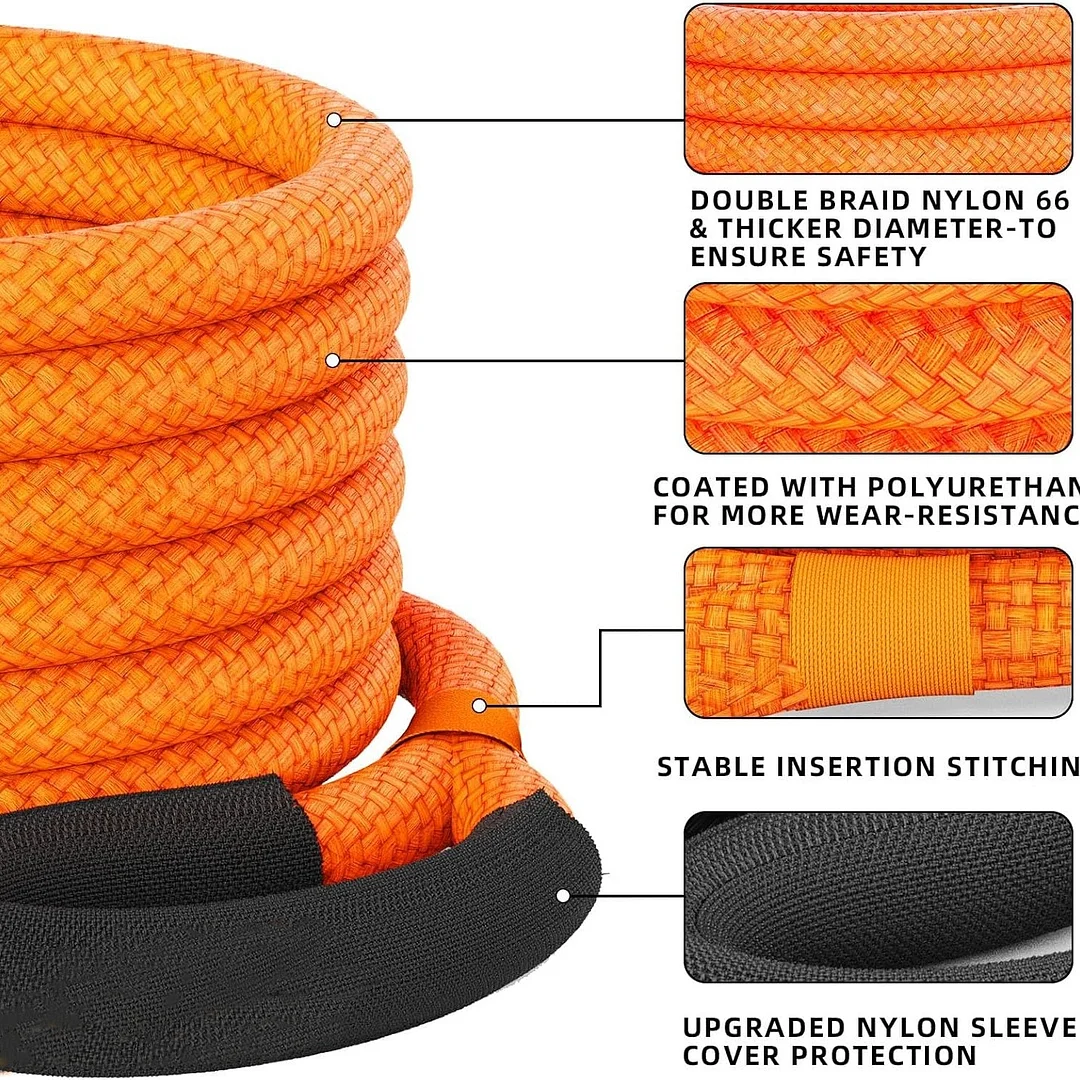 Kinetic snatching: Length: 30ft/9M. Diameter: 1.5in/38mm. Color: High-Visible Orange for clear visibility and safer recovery. Made of 100% Nylon N66, the Kinetic Rope acts like a rubber band with over 30% elasticity. By storing and releasing kinetic energy, it helps you get unstuck easily and is less likely to cause vehicle frame damage compared to normal tow straps.