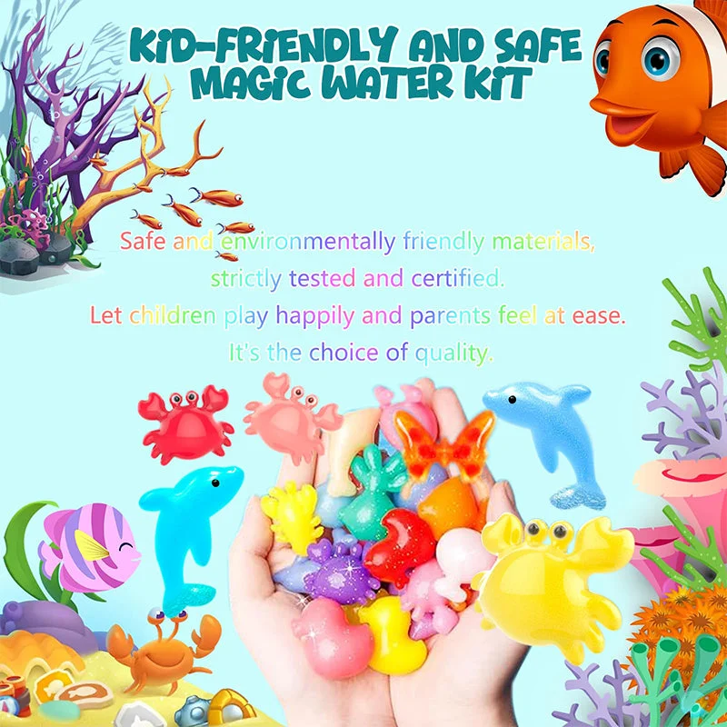 Bright colors and educational play: Designed with bright, eye-catching colors, the magic water elf kit is excellent for toddlers learning about colors. The variety of sea creature molds enhances cognitive skills through shape and color recognition.