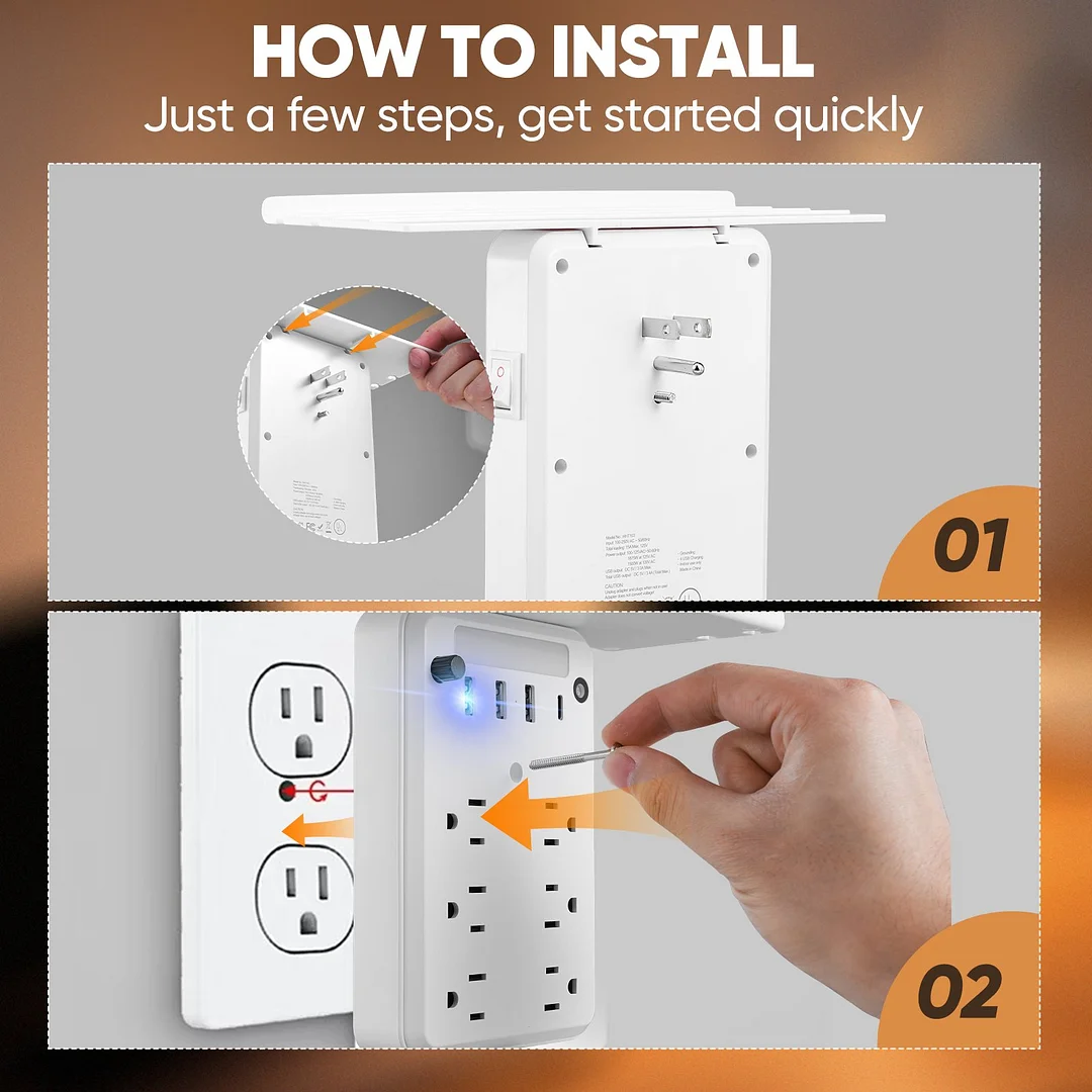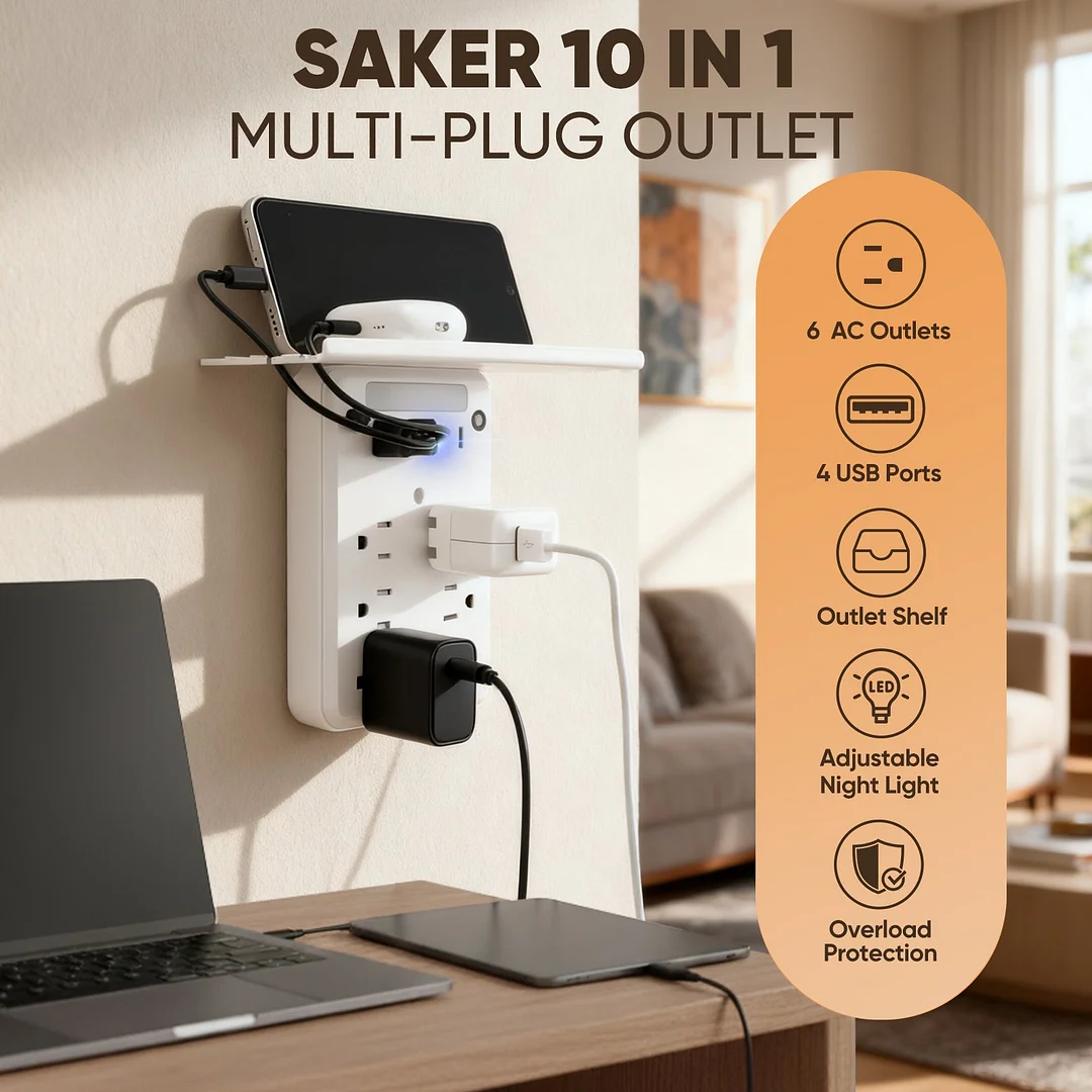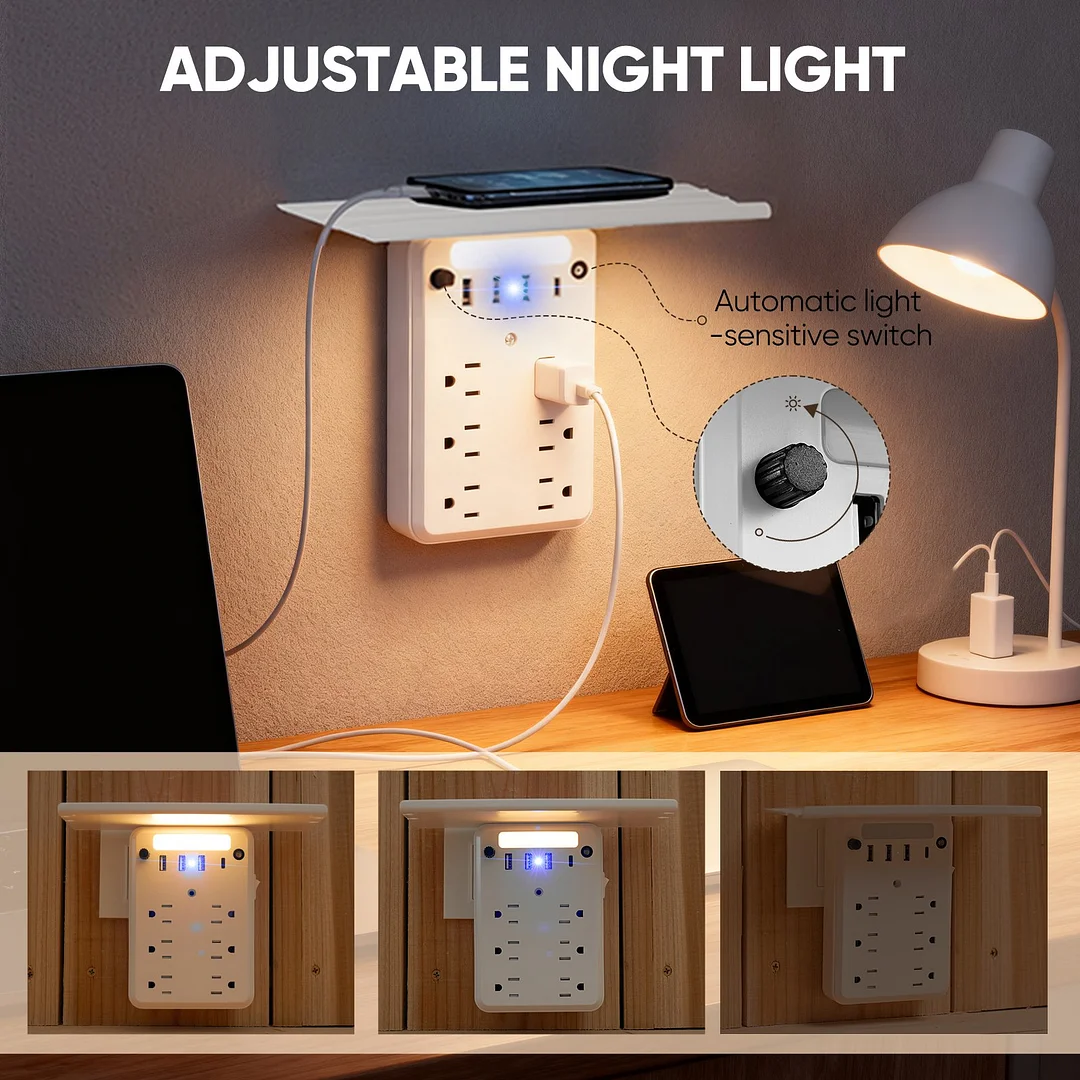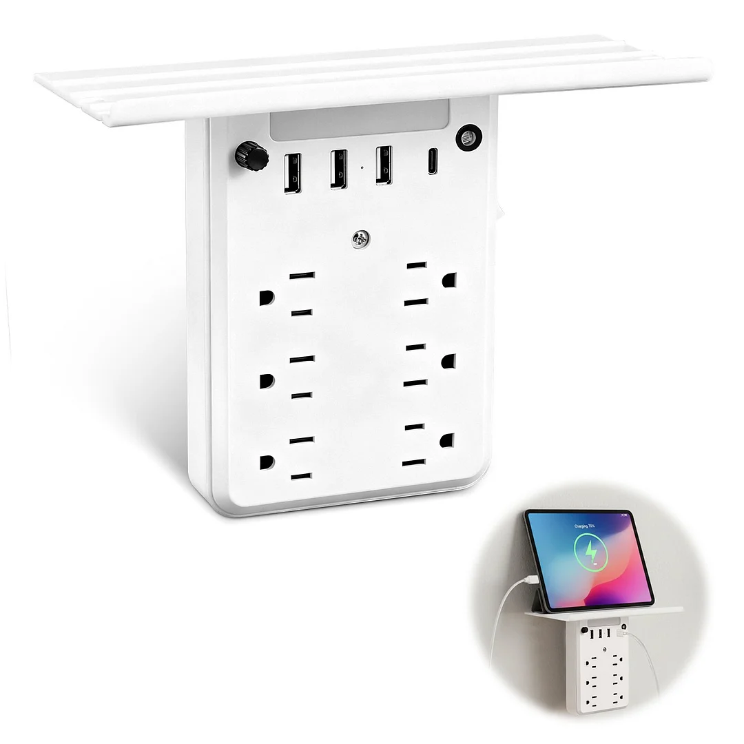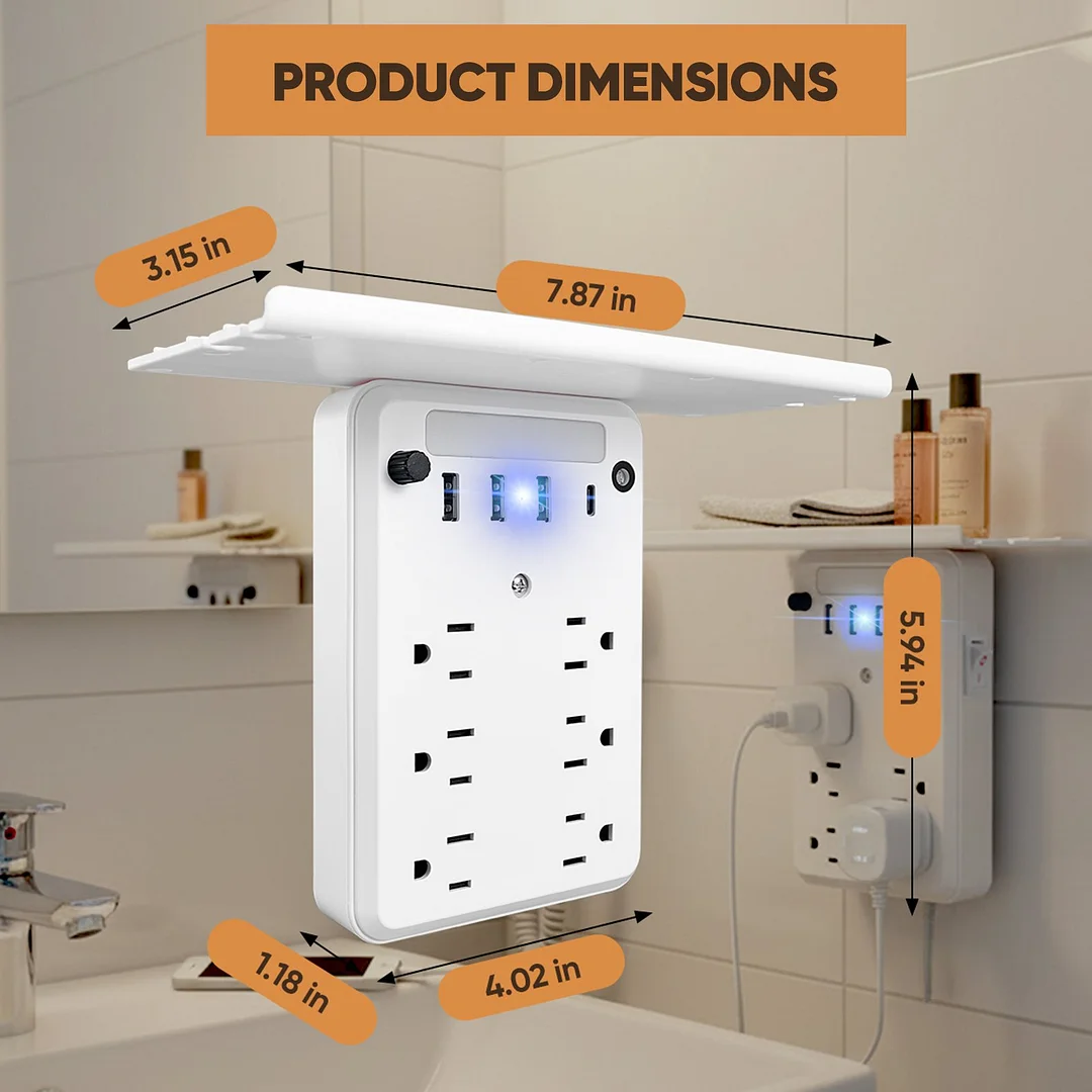 【All-in-One Charging Station with Storage Shelf】Keep essentials organized and powered! Our hub combines 6 AC outlets, 3 USB-A ports, and 1 USB-C port with a spacious, non-slip shelf perfect for phones, tablets, keys, or glasses. No more clutter—just a tidy and efficient charging space ideal for your desk, bedside, or office.
