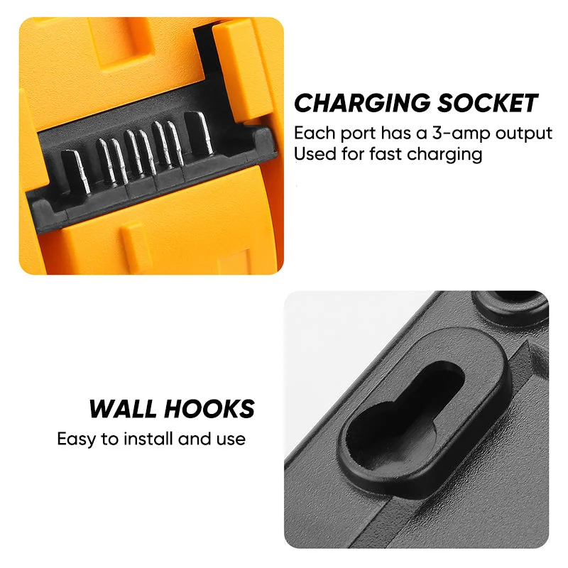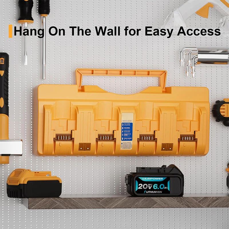 Efficient charging: The DCB104 Battery Charger Station has 4 charging ports (can charge at the same time). Input: 100-240V; Output (each port): 20V-3A. It only takes about 1.3 hours to fully charge 4 DCB204 batteries, greatly improving work efficiency.