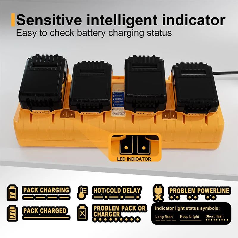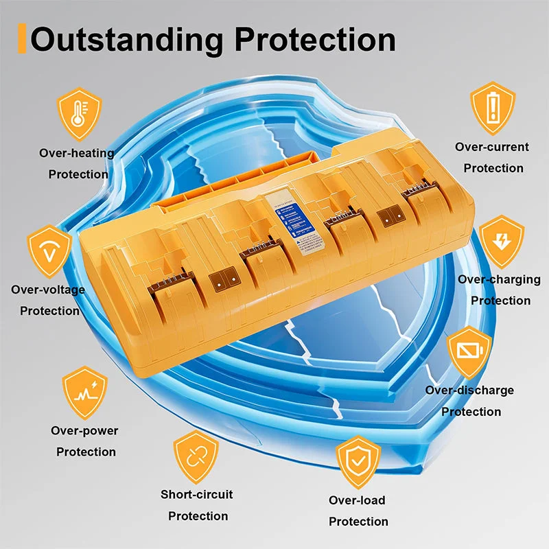 Advanced protection systems: The multi battery charger station has four internal protection safety systems to effectively prevent over-voltage, over-current, overheating, and short circuit. The charger shell is made of flame-retardant material, and its fire-proof performance is safe and reliable.