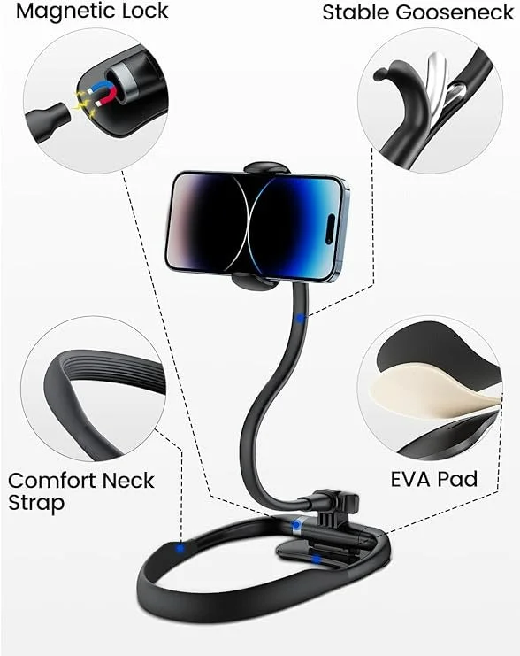 Flexible and adjustable gooseneck: The neck holder is connected to the phone holder through a flexible gooseneck, allowing you to adjust it to your desired angle effortlessly. With a 16-inch gooseneck that offers excellent flexibility, you can explore various usage scenarios for this versatile neckband phone holder.
