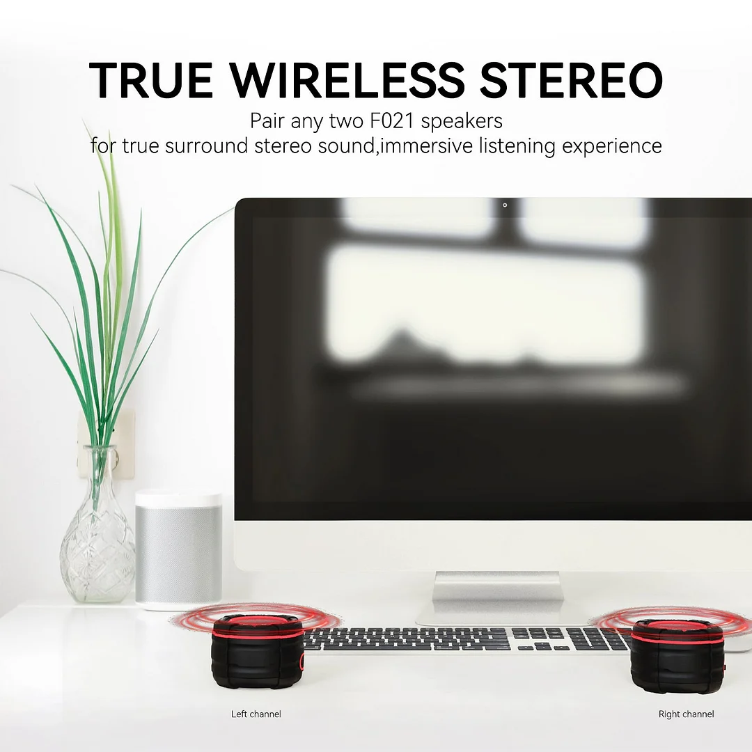 True Wireless Stereo Sound: Enjoy true wireless stereo sound by pairing any two F021 speakers together for immersive surround sound. Perfect for outdoor activities, beach trips, or backyard parties.