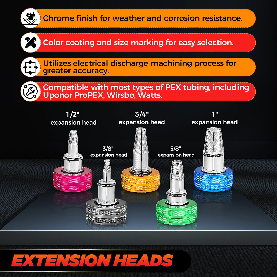 Complete Kit, Robust Construction: This PEX expansion tool set provides all the essentials for efficient operation. It comes with 5 expansion heads (3/8", 1/2", 5/8", 3/4", and 1") or 3 expansion heads (1/2", 3/4", and 1") and a tube cutting tool for accurate results. Each component is expertly engineered from high-strength aluminum alloy, offering exceptional durability, lightweight maneuverability, and ease of use in confined areas.