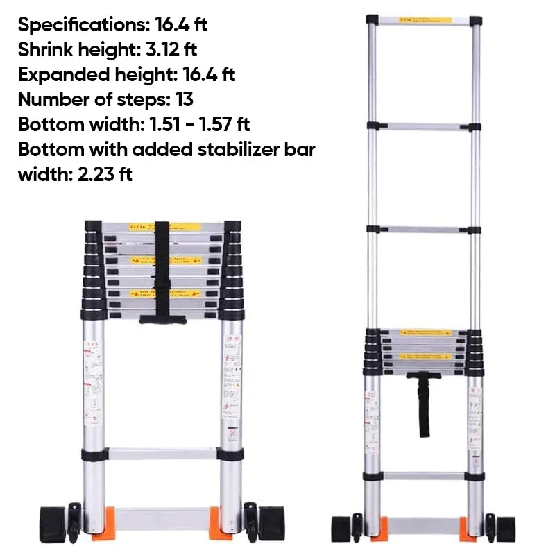 Portable and easy to carry: This telescoping ladder has a small volume and takes up very little space. The straight ladder folds in height from 3.12ft to 16.4ft, making it easy to store behind the door, under the bed, in a cabinet, or in the trunk of your car.