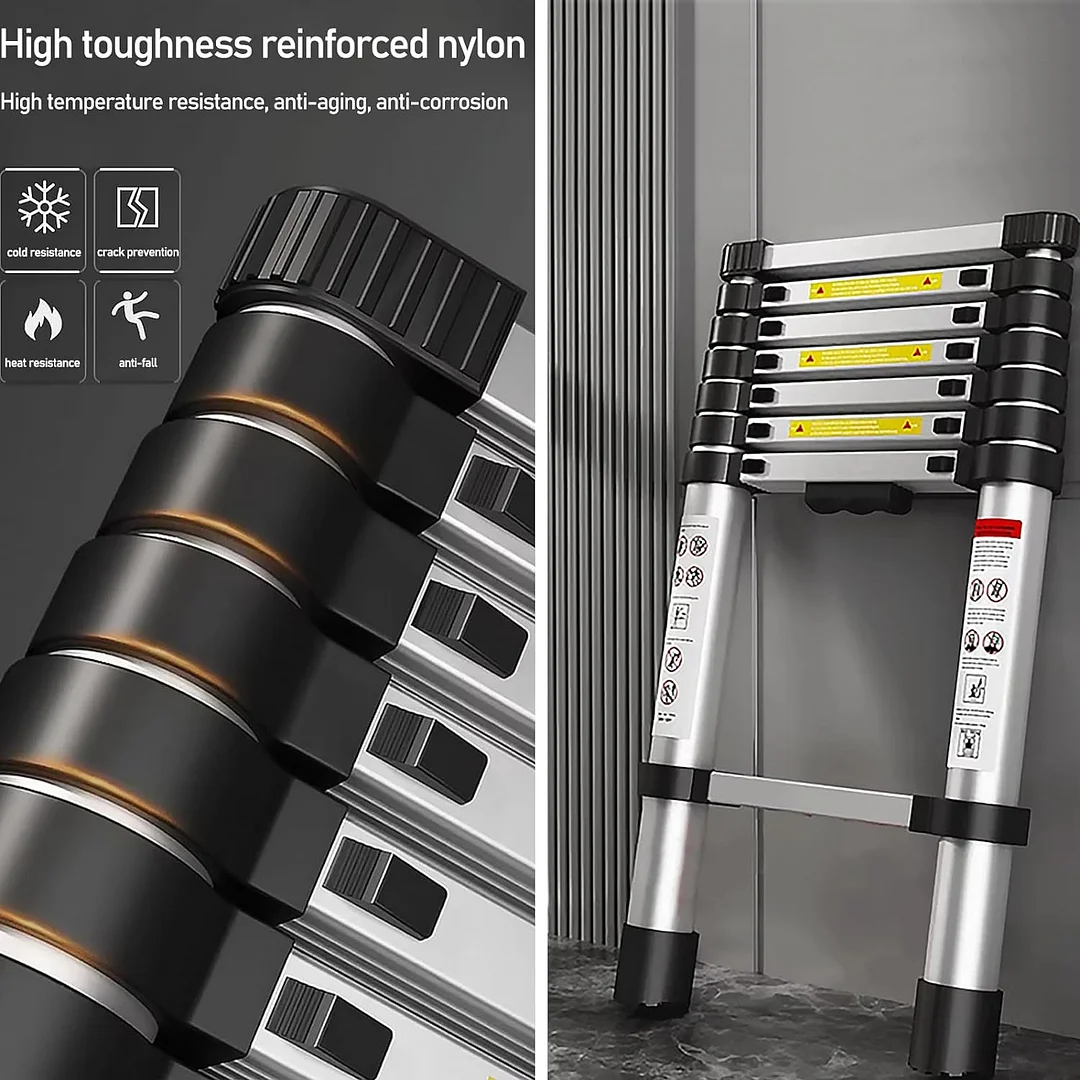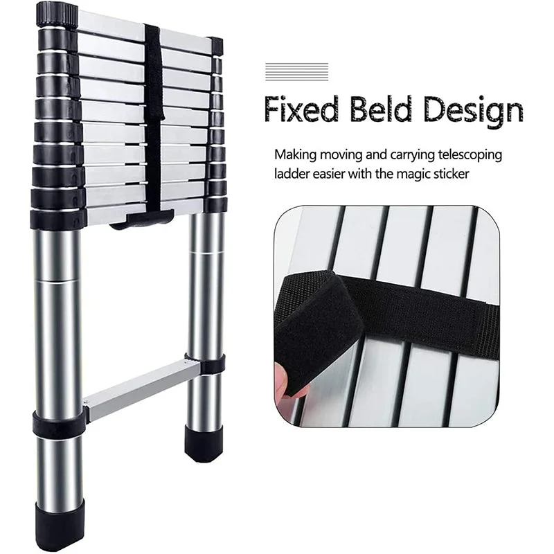 Lightweight and high weight capacity: The telescoping ladder is lightweight and compact, weighing only 26.7 lbs. It is secured with a fixed strap, allowing for easy one-handed carrying. The ladder supports a maximum load of 330 lbs.