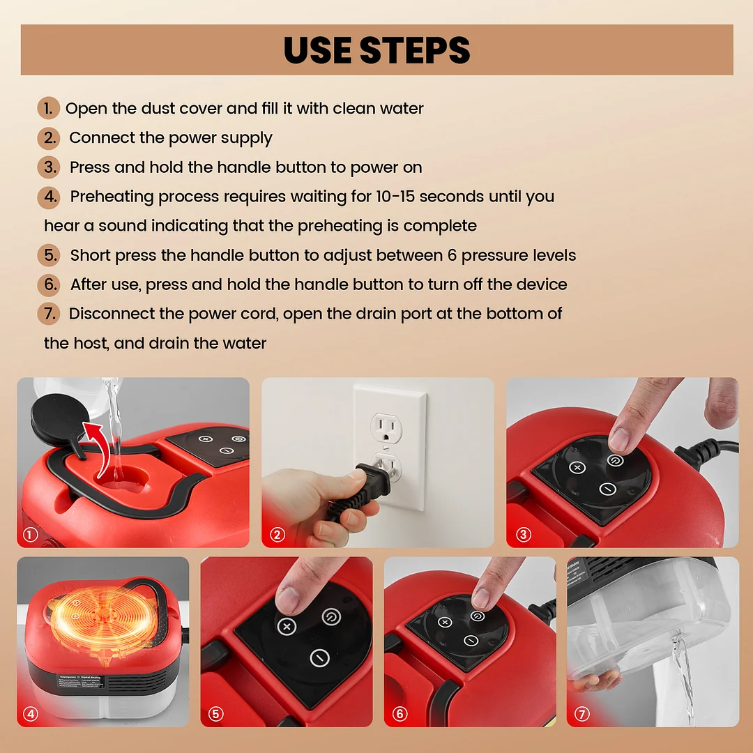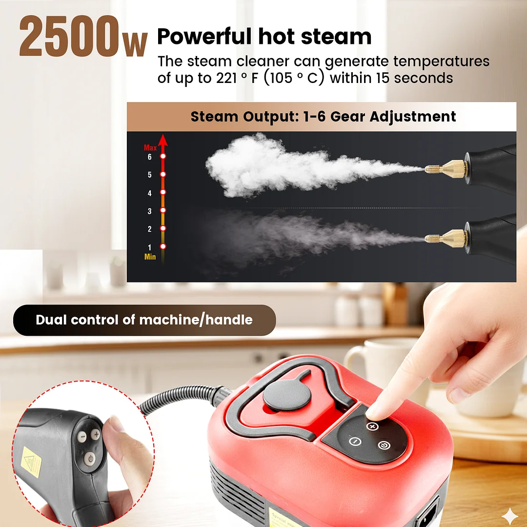 6-gear adjustable steam control: Customize your cleaning power with ease! Regulate steam output directly—gentle for fabrics, strong for tough tile or engine dirt. Simple and intuitive to use.