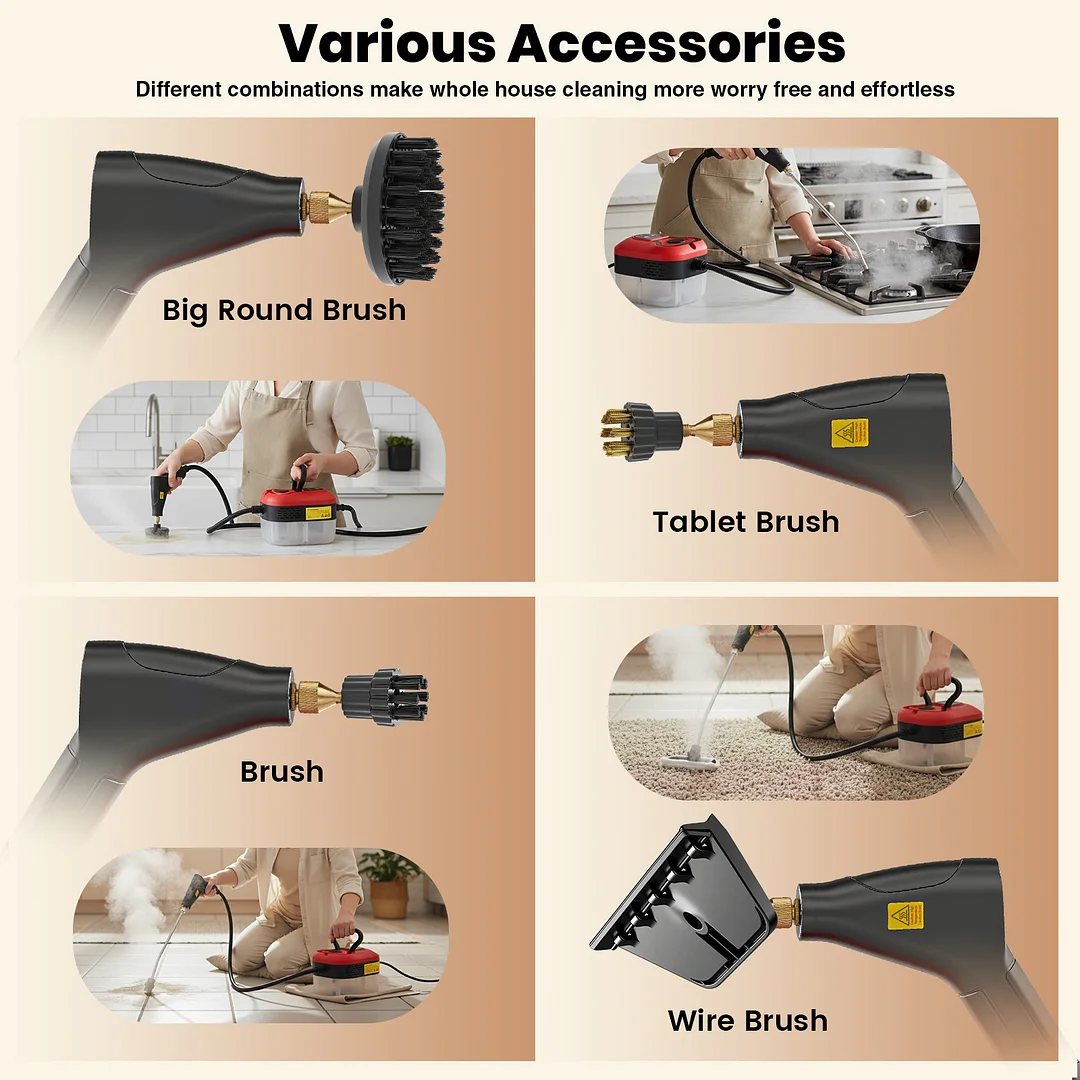 All-in-one attachments for home & auto: Equipped with specialized tools for versatile cleaning. The steam cleaner tackles tile, grout, windows, upholstery, and pet areas—great for kitchens, bathrooms, furniture, and car interiors.