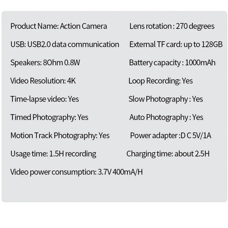 Ultra-high-definition record: Capture every adventure in stunning clarity with the Portable Video Blog Camera! Featuring 4K ultra-high-definition recording, this action camera delivers crisp and detailed footage. Built-in stabilization ensures smooth, shake-free videos, while the support for an external microphone enhances audio quality. With a 270° manual rotation design, you can easily adjust angles for the perfect shot. Whether you're on the go or capturing dynamic scenes, the Camera is your ultimate companion for every moment.