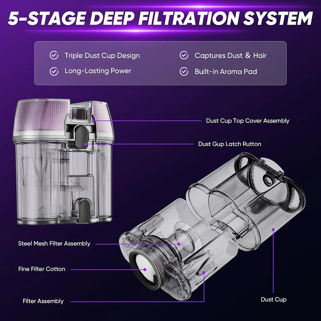 Efficient dual dust cups: The filter captures 99.9% of particles as small as 0.3 microns, without blocking and maintaining peak filtration efficiency for fresh air release and thorough cleaning.