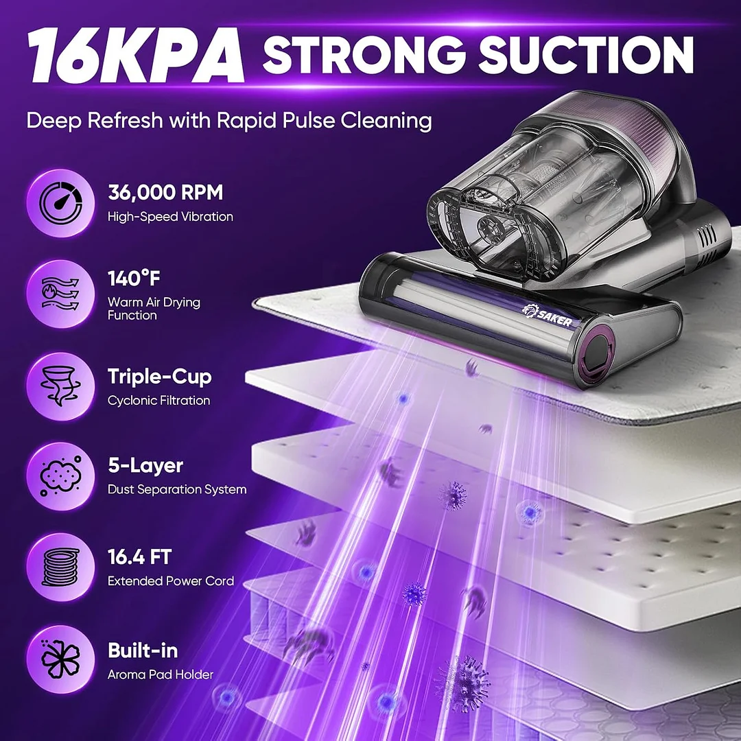 Powerful cleaning: Boost 16Kpa suction and power for efficient dust, allergen, and pet hair removal from mattresses and fabrics saving time and effort.