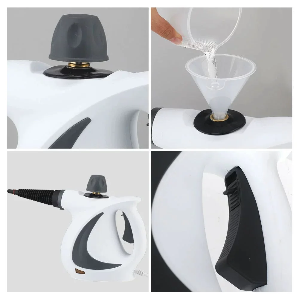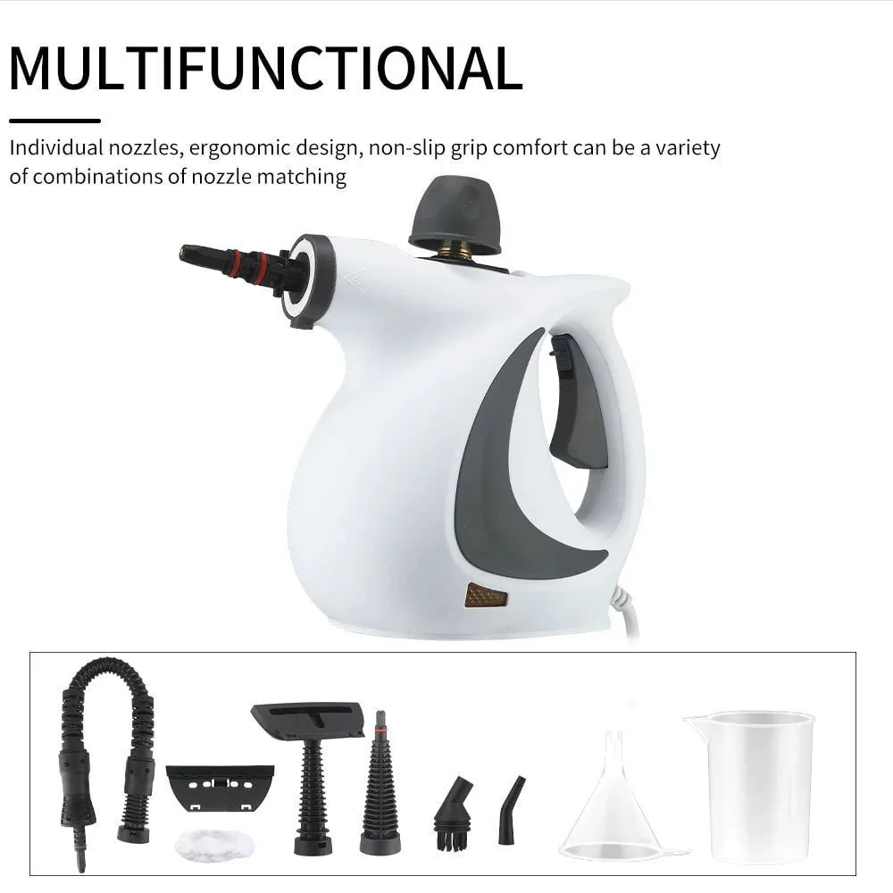 Accessory set: This handheld cleaner and sanitizer set includes 8 accessories: a measuring cup, a funnel, a window cleaning tool, a round nylon brush, an upholstery tool, a nozzle, a towel sleeve, a bent nozzle, and a 22.4-inch (57 cm) flexible hose with a gun nozzle.
