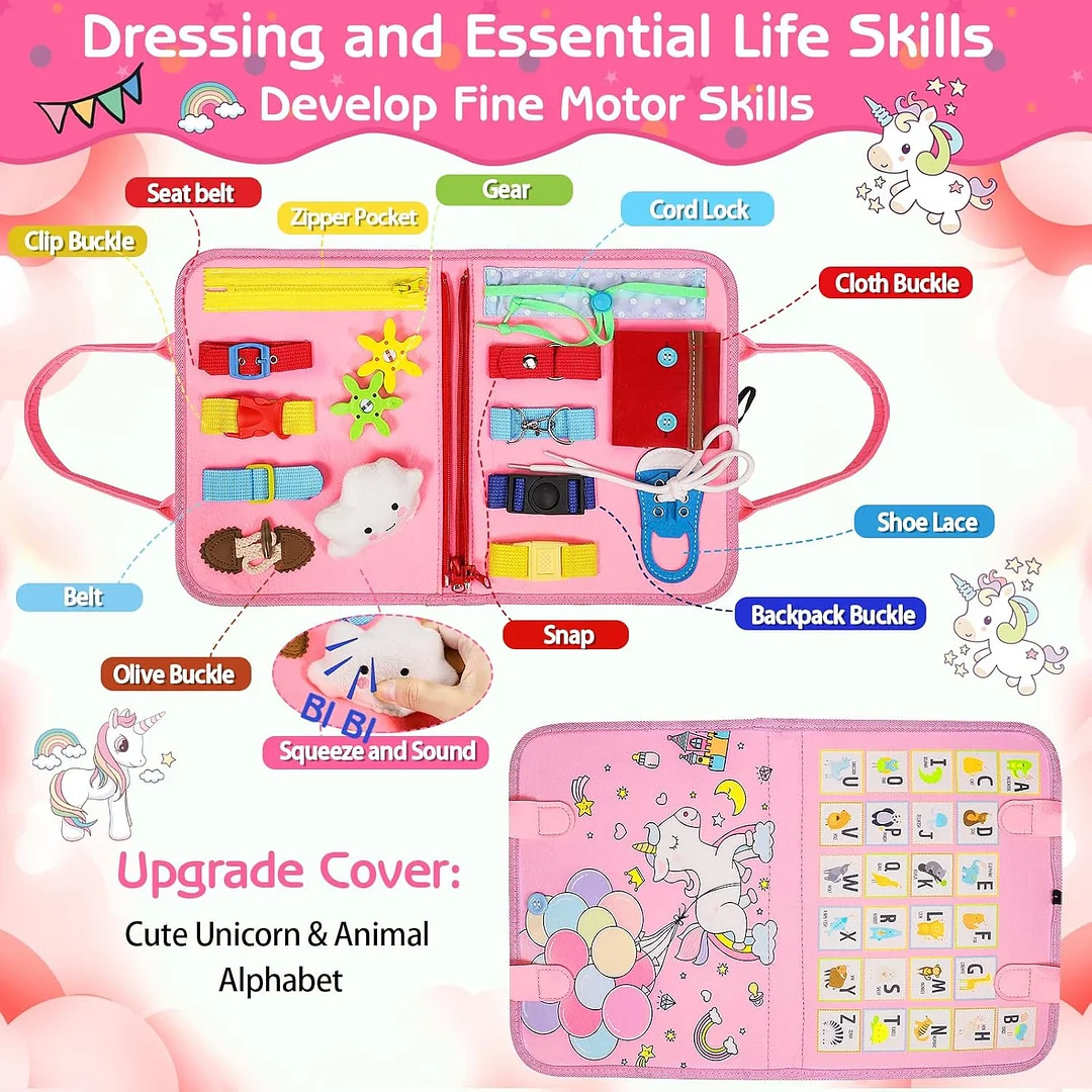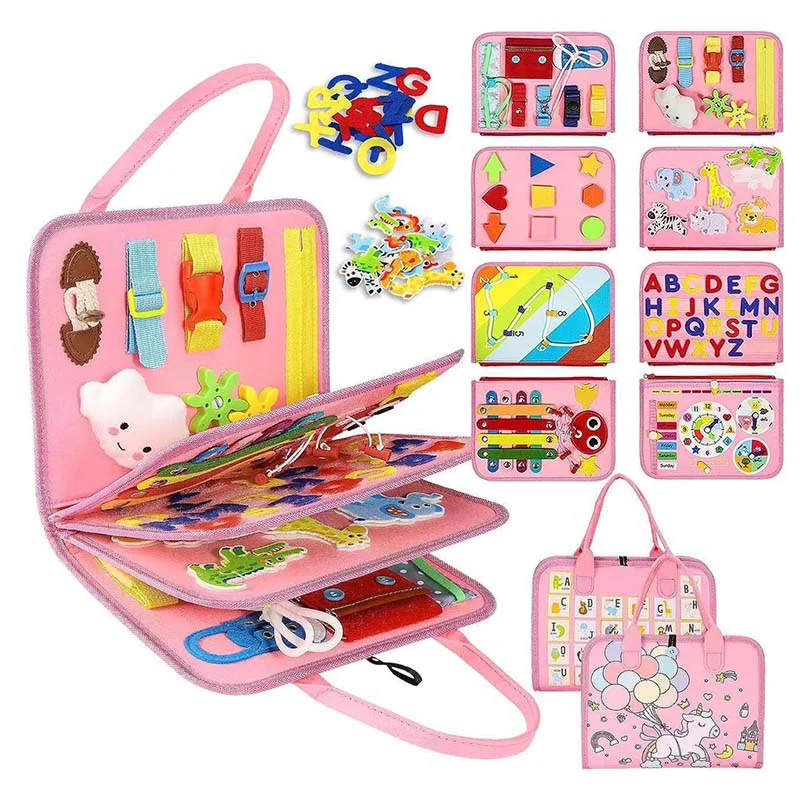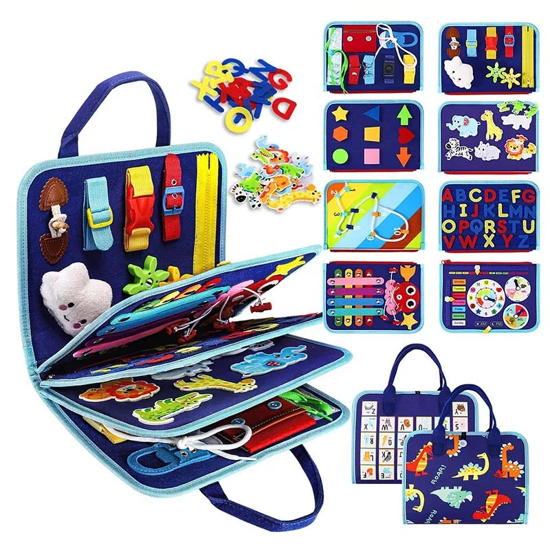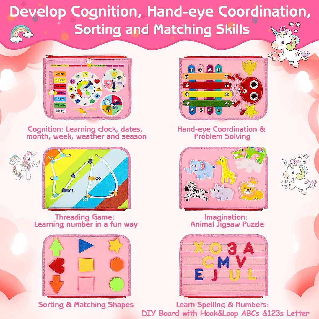 8 pages, endless fun: Our innovated busy board for toddlers has 8 pages to play, featuring multiple varieties of toddler activities, can keep your little one busy for hours. This toddler busy board is designed in varying difficulty levels to be challenging but not too much to keep your toddlers interested. Including zipper, shoelace, belt, button, clock, calendar, shapes matching, threading numbers, hook&loop letter, jigsaw animal puzzle and etc.