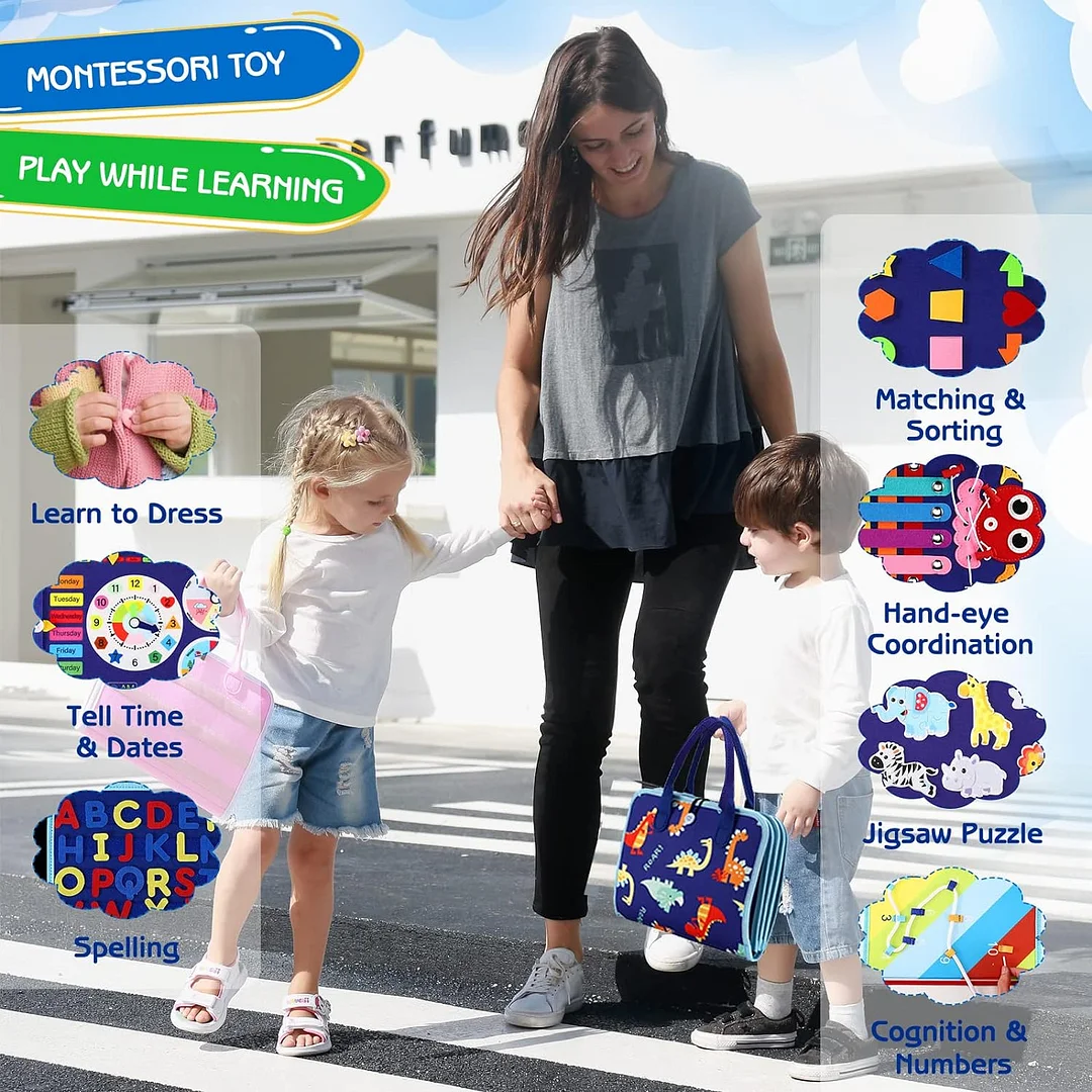 Soft & portable toddler travel toys: Our sensory toys for toddlers 1-3 is made of toxic-free soft fabrics and felt with no hard corners, safe for your little toddlers to play. Busy board with handle, portable for toddlers to carry and flexible to fit in most diaper or school bags. Great toddler activities sensory board to keep them occupied while on car, airplane, travel or settings needing quiet.