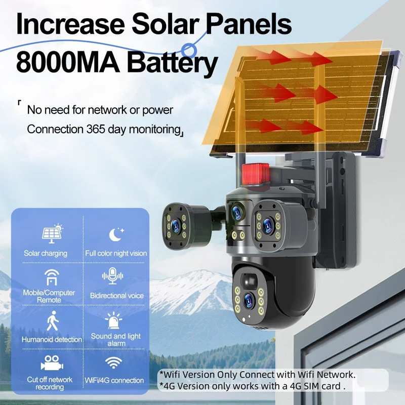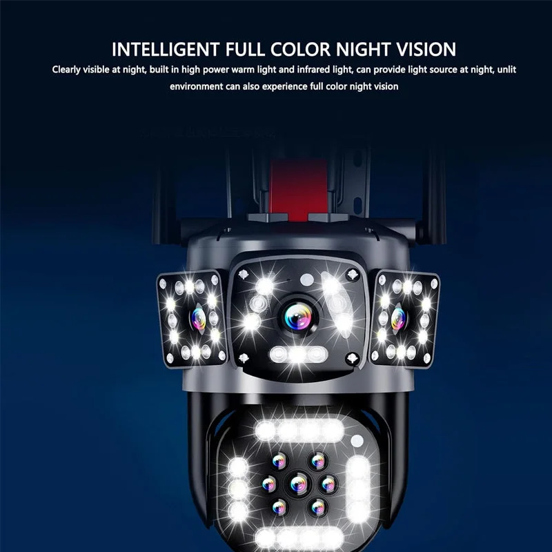 Triple-sensor coverage skill: Three strategically positioned lenses capture overlapping degree views simultaneously erasing blind spots and delivering comprehensive panoramic monitoring for large areas such as farm perimeters fishponds and expansive properties.