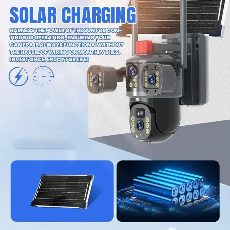Continuous solar working: Harnessing renewable solar energy for autonomous power this security system stops wiring hassles and ensures uninterrupted surveillance with its high-efficiency solar panel maintaining constant functionality in remote outdoor locations.