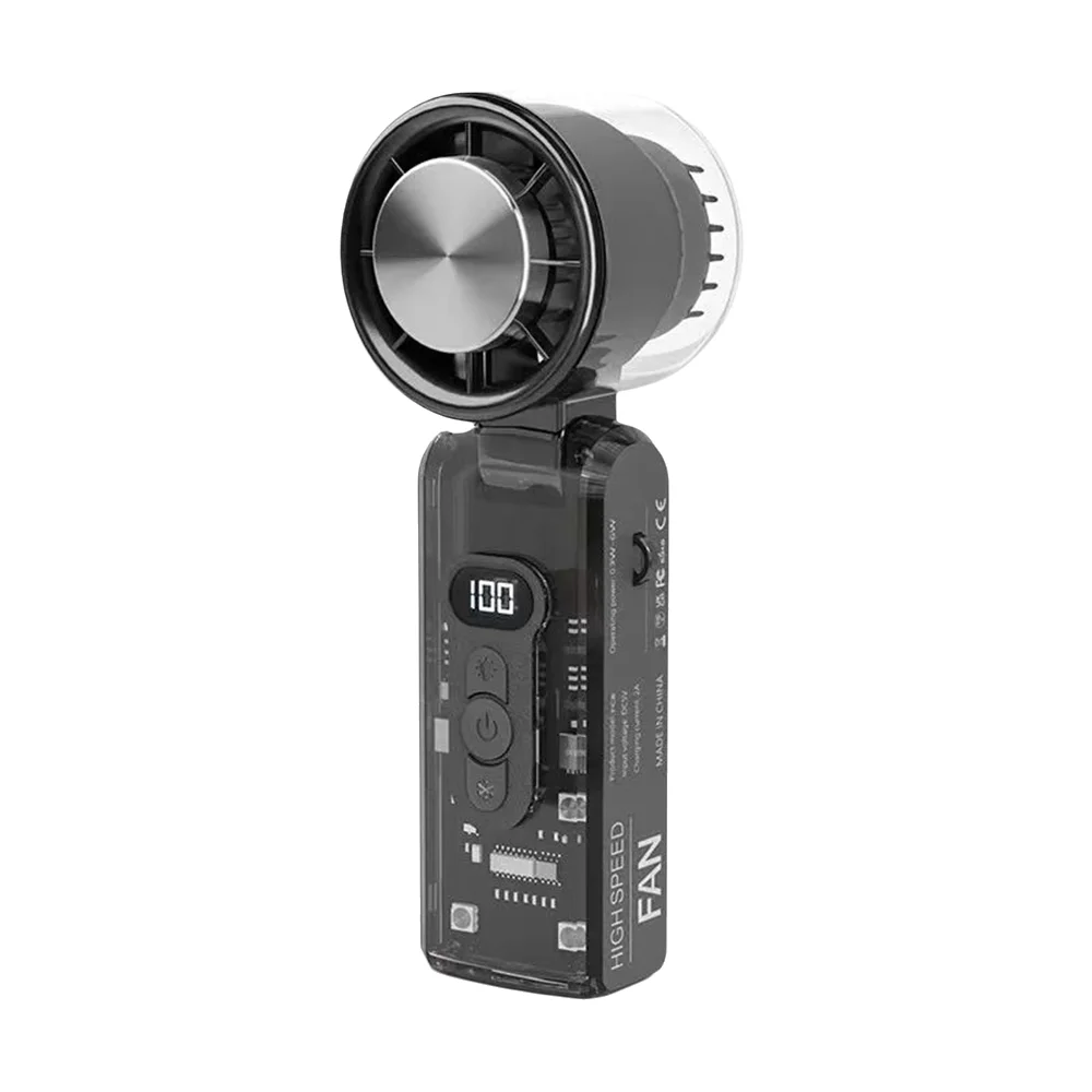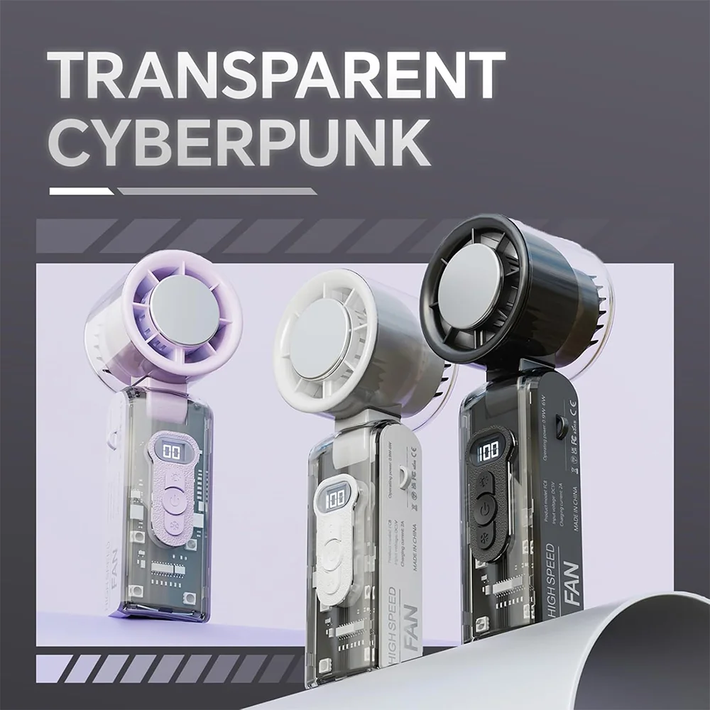 Led light with cyber style design: Combining function and flair, this turbo fan includes built-in LED lighting and a fully transparent, cyberpunk-style casing. Great for nighttime visibility or tech lovers seeking a modern portable handheld turbo fan with personality.
