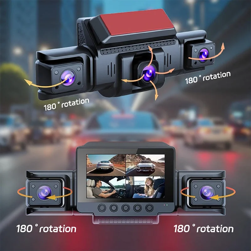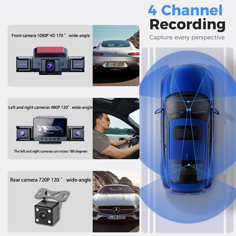 Side cameras: Both left and right cameras rotate up to 180°, giving you the flexibility to aim toward door zones, interior space, or lane edges. These side cameras add critical blind-spot coverage, capturing events such as side swipes, close passes, or door openings. They work seamlessly with the front and rear lenses to deliver true 360° all-around monitoring, enhancing your driving awareness and safety from every direction.