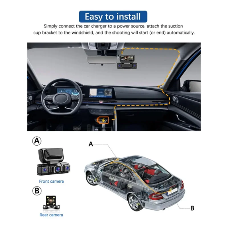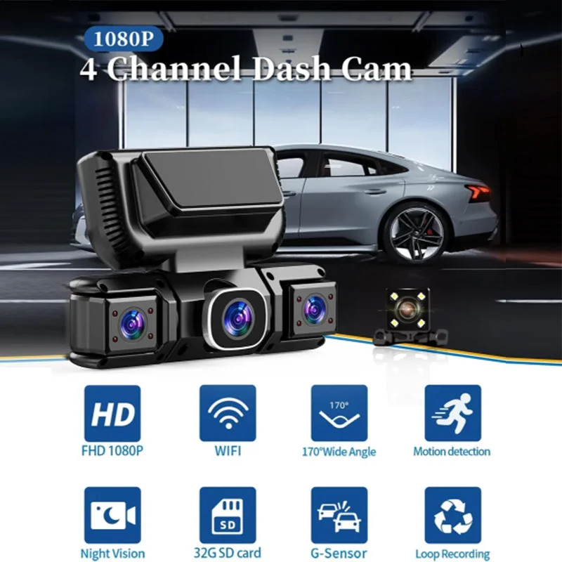 4 channel camera with recording: The quad 1920*1080P dash cam's 150-degree super wide-angle lens and 3 inches huge LCD screen give sharper movies and images even when traveling at high speeds, and allow you to re-watch important moments. The first dash cam that can simultaneously record the front and sides of the vehicle and the two cabin cameras can freely change the recording angles and rotate left and right allowing you to record in opposite directions as well.
