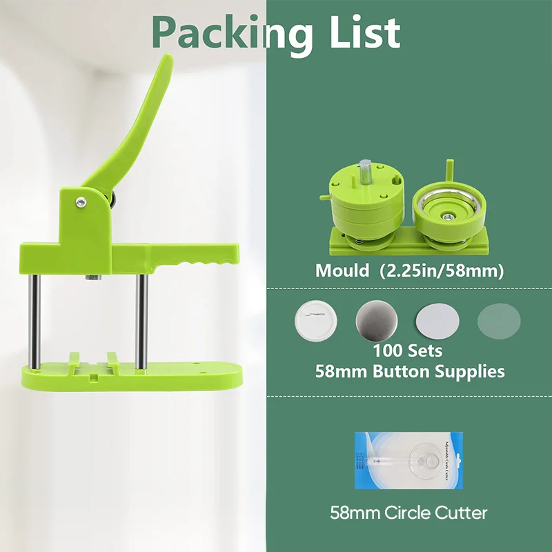 Kits: Includes 1 detachable button maker machine, 1 58mm mold, 100 sets of 58mm button parts with clear films and blank papers, circle cutter.
