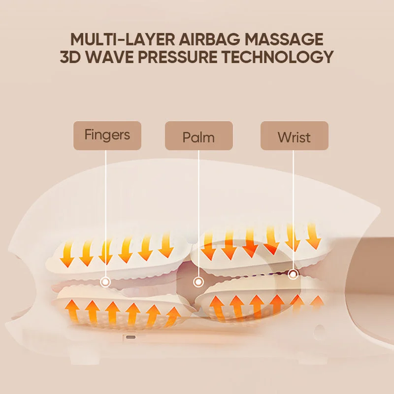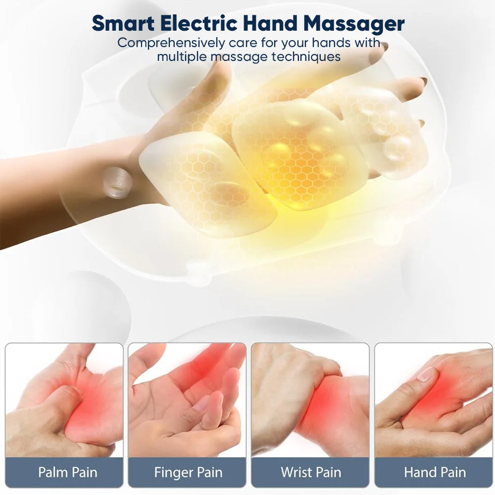 All-around hand massage therapy: hand massager delivers deep kneading with four massage heads and rhythmic air compression. Targets acupuncture points across fingers, palms, and wrists for full-hand relaxation and circulation support.