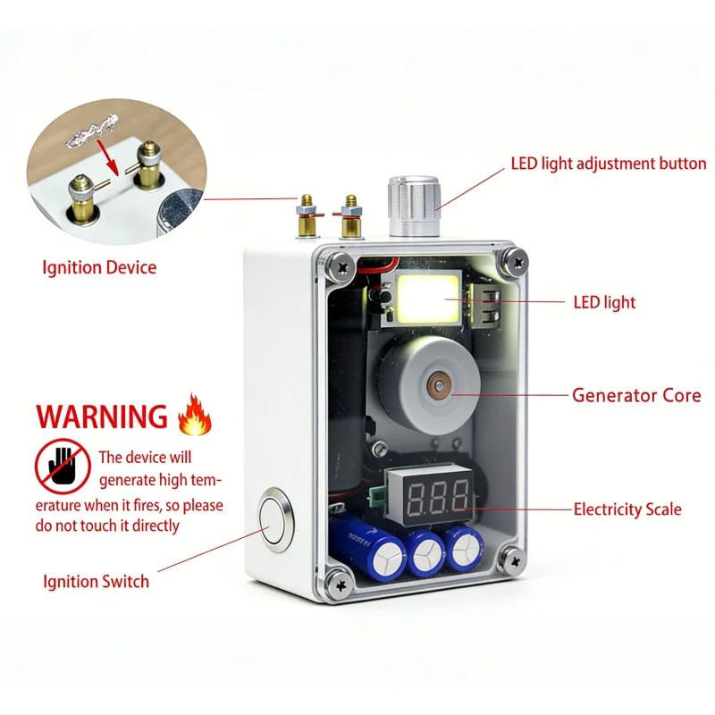 Operation instructions: The voltmeter automatically displays when the I button is pressed, and when the voltage is greater than 5V, USB charging is available for other devices, while pressing the metal button on the left releases an electrical spark between the two top copper posts.
