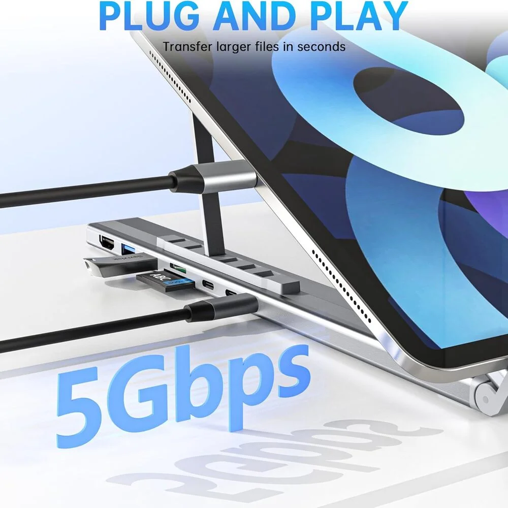 8 in 1: This laptop stand with ports transforms your cluttered desk into an organized workspace. Its plug-and-play design lets you easily connect all your laptop peripherals. It features 4K HDMI output, USB-A and USB-C 3.0 ports for 5Gbps data transfer. SD/TF card transfer speeds reach up to 25MB/s. It’s the perfect gift for business professionals, content creators, nomadic workers, and college students.