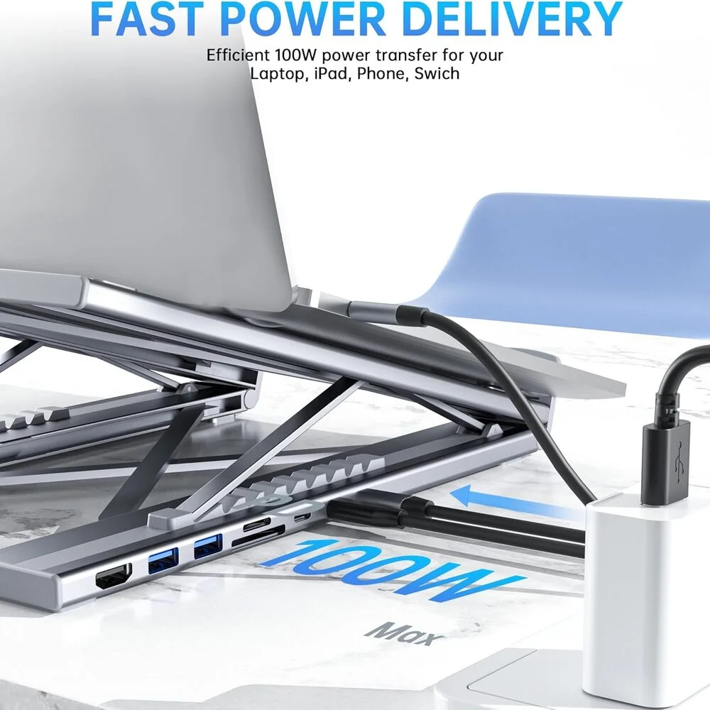 100w: This portable laptop dock stand provides 85W of charging power for your laptop, with 15W reserved for connected peripherals. When using an external hard drive for data transfer, ensure that the laptop is in a charging state. Note: For a stable connection, please do not use this laptop stand hub for high-power devices. Supports a maximum of one hard drive.