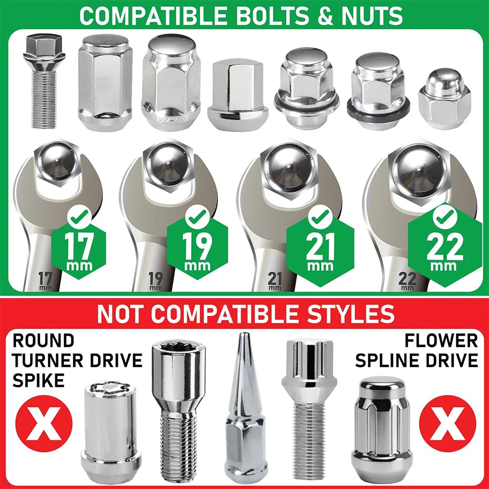 Compatible: Compatible With Conical, Spherical, Flat Seat, Mag Seat, And Open/Closed-Ended Lug Nuts/Bolts. Not For New, Deep-Recessed, Or Locking Nuts.